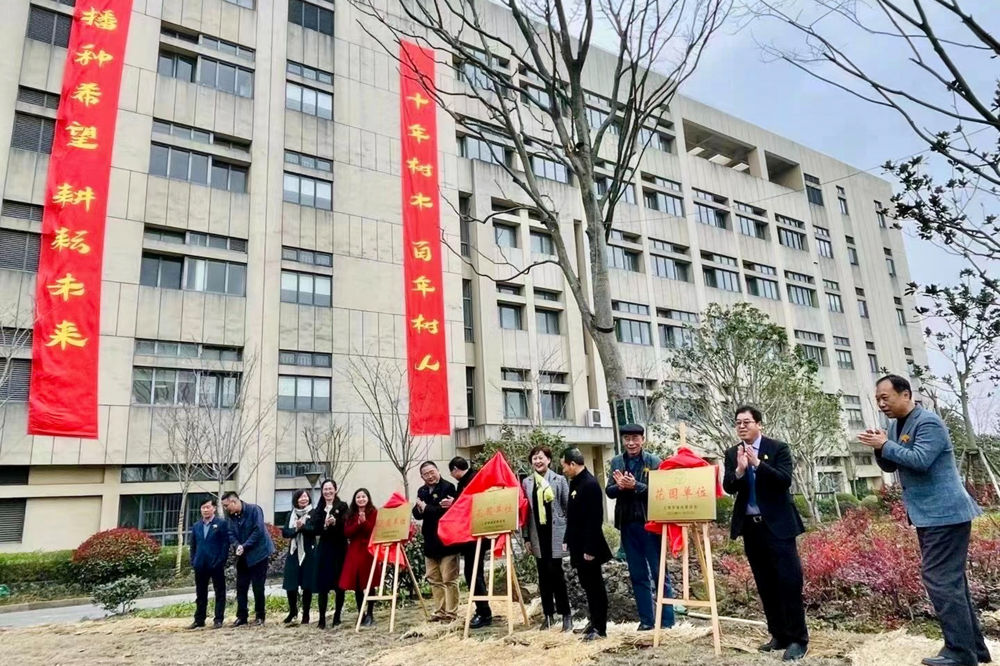 恰逢植树节,全体嘉宾和校园长、师生代表一起为园区新添两棵“榉树”,表达对学子的殷殷期盼和美好祝愿,并为紫竹幼儿园、紫竹小学和华二附属初中的“上海市花园单位”揭牌。