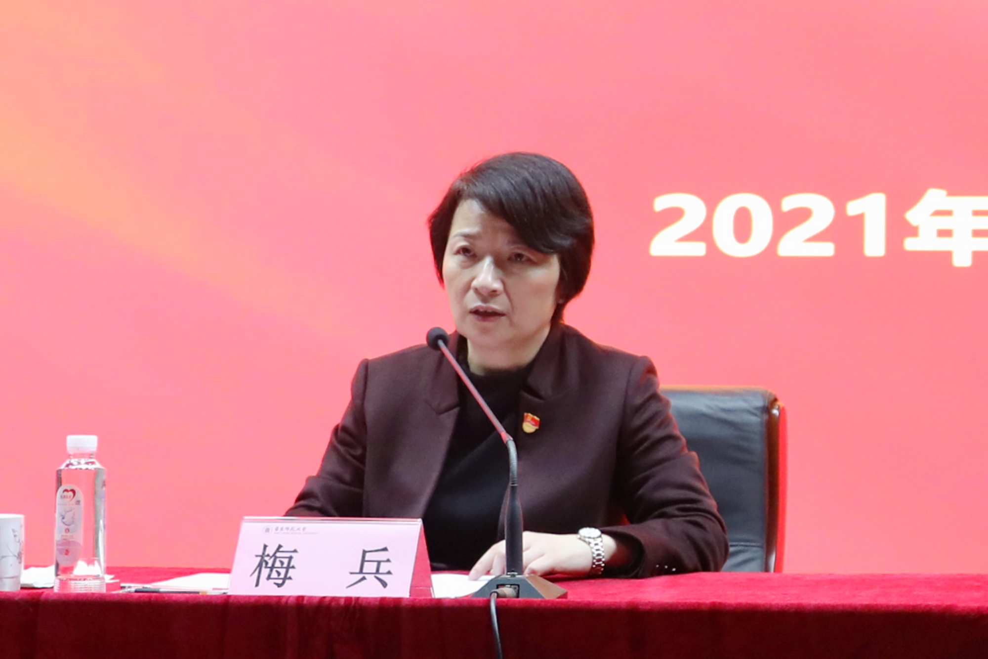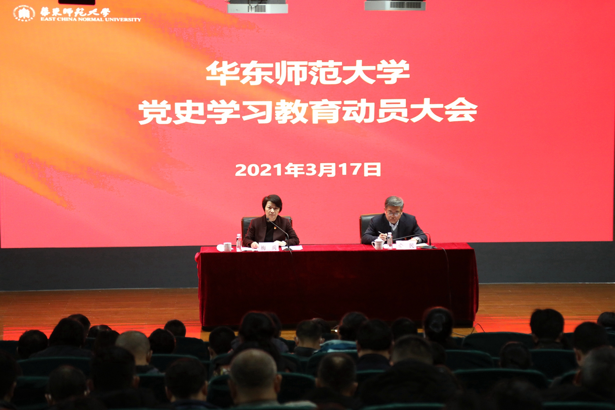 3月17日,华东师大召开党史学习教育动员大会,校党委书记梅兵作动员讲话,校长钱旭红,校党委副书记杨昌利、曹友谊,副校长孙真荣以及全校处级党员干部出席会议。校党委副书记朱民主持会议。