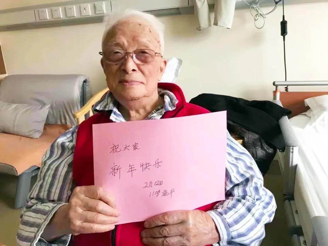 2月12日新春佳节,111岁施平在病房里向大家问候新年快乐