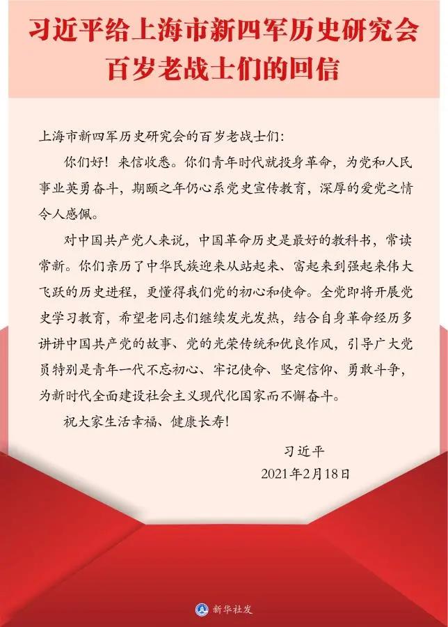 中共中央总书记、国家主席、中央军委主席习近平2月18日给上海市新四军历史研究会的百岁老战士们回信,向他们致以诚挚问候和美好祝福。