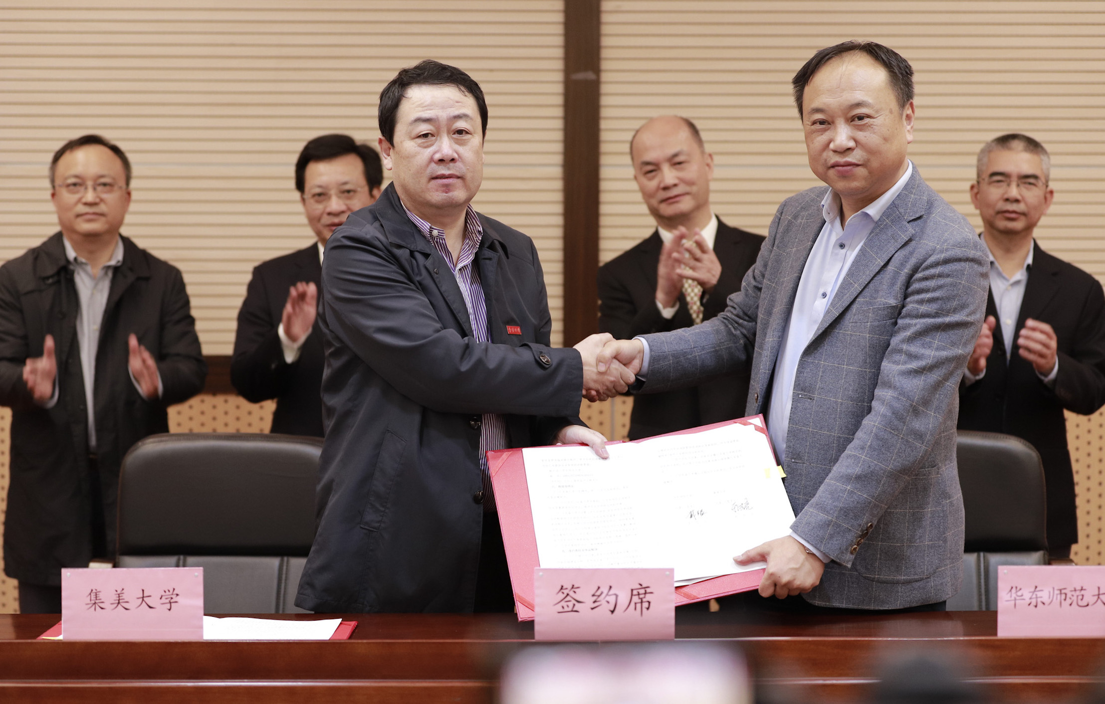 华东师大副校长、基础教育与终身教育发展部部长戴立益与集美大学党委常委、副校长于洪亮代表两校签约