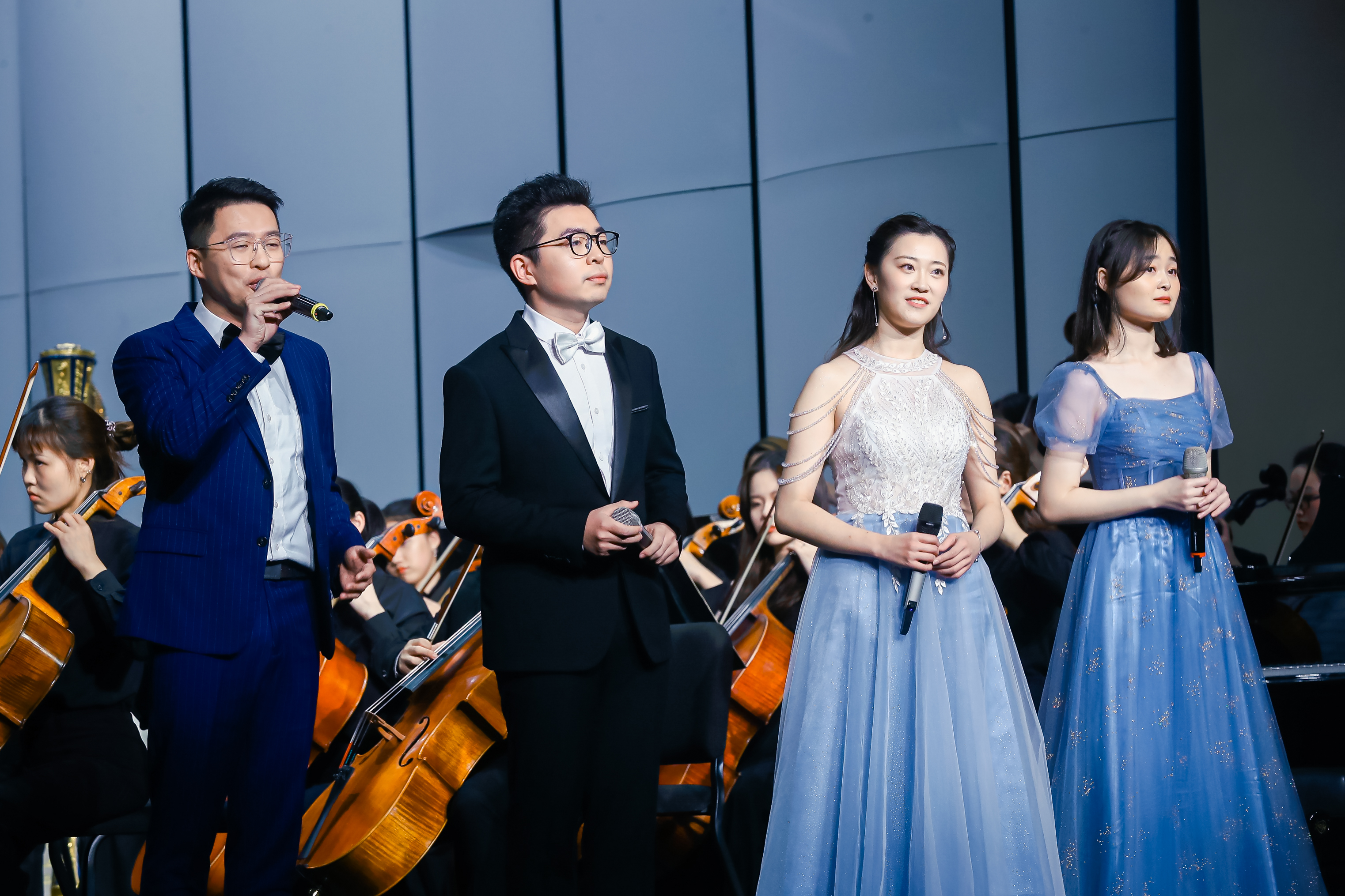 音乐会由著名小提琴演奏家、指挥家、音乐学院常林教授执棒,华东师大交响乐团纯熟的演奏技巧和饱满的舞台张力,为观众们呈现了一台中外优秀音乐文化相融合的视听盛宴。音乐会在一曲热烈欢快的《春节序曲》中拉开序幕;音乐学院副院长、中国当代优秀钢琴家张薇副教授的钢琴独奏《黄河颂》以壮阔的意境表达对祖国和民族的无限深情;原上海市教卫工作党委书记、上海市艺术教育委员会主任、上海市艺术教育协会会长陈克宏,原上海市教育委员会副主任、上海市艺术教育委员会副主任李瑞阳,奥盛集团有限公司董事长汤亮校友和华东师大党委常务副书记王宏舟作为神秘嘉宾登台献唱《在那遥远的地方》和《鸿雁》,向师大70周年华诞献礼;历届“校园十大歌手”得主代表孙骏、顾斐、胡乐野、傅彦斌、铁悦心、陆韵琇、陶佳宁和石评月等带来《上善若水》等三首校庆主题歌曲联唱,深情歌咏了师大精神;音乐学院特聘教师、上海交响乐团李笑男博士的小号独奏《天空之城》尽显师大的沉静美好;音乐学院师生创作的管弦乐《丽娃河畅想曲》将丽娃河的钟灵毓秀和吾辈师大人的奋发昂扬演绎得淋漓尽致;青年笙演奏家张梦带来了《挂红灯》,欢快轻盈,舒美流畅的曲风中洋溢着新年祝福与美好愿望;音乐学院特聘副教授汤非、副教授石春轩子与学生艺术团VIVA合唱团共同演绎的《不忘初心》,以“万水千山不忘来时路”,激起人们心中无限的爱国情怀;小荧星合唱团压轴登台唱响《蓝色多瑙河》和《友谊地久天长》,童音纯净宛如天籁,入耳入心,将现场气氛推向高潮。