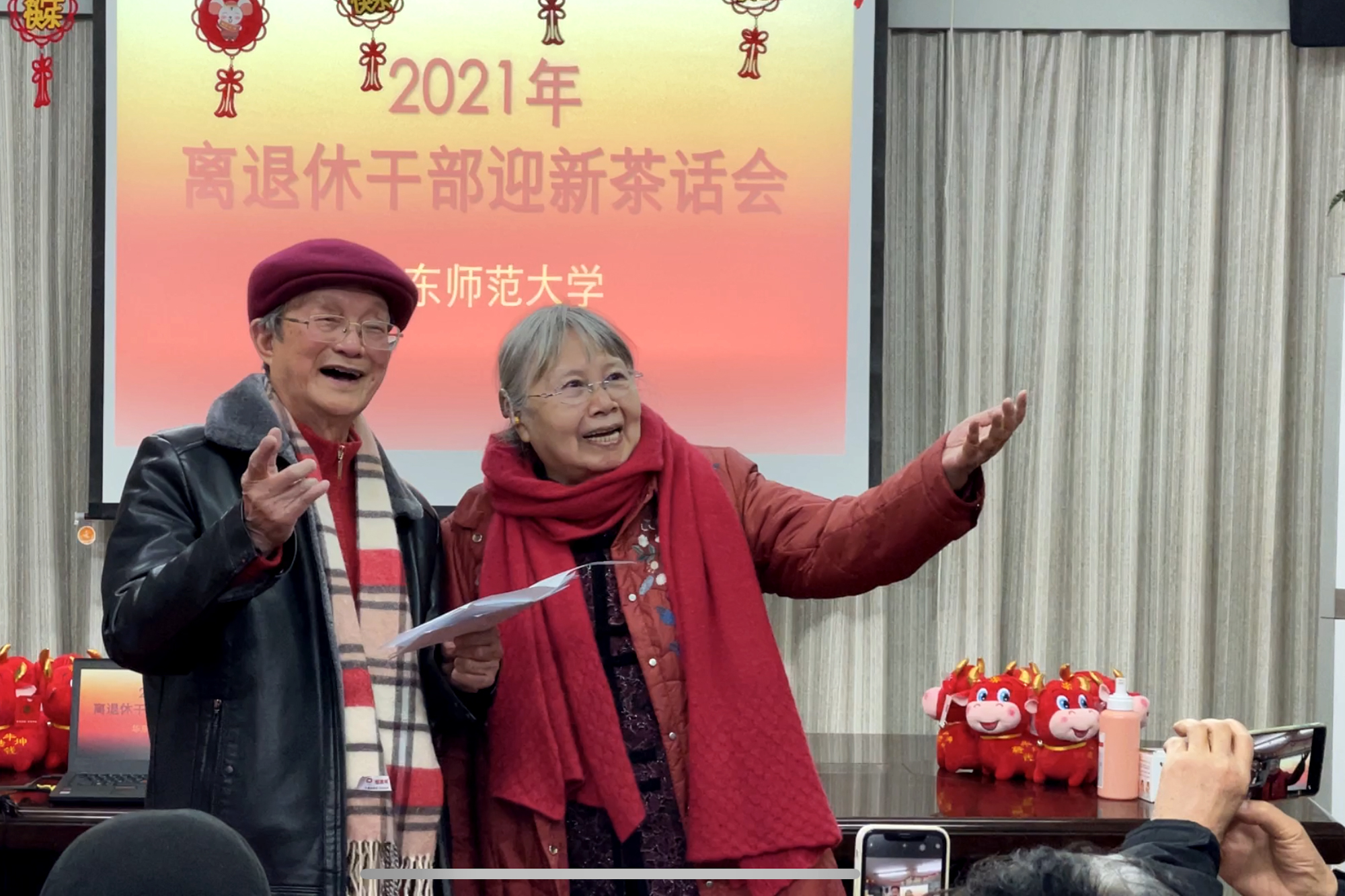 茶话会上,老同志们观看了2020年离退休工作回顾短片。在校党委领导下,2020年华东师大老龄工作有条不紊地进行,较好地完成了各项工作任务。老同志们积极参与防疫,参加校内外的组织活动并发挥作用。在最后的文艺演出中,老同志纷纷展现自己的拿手节目表达欢喜之情,茶话会在全场《歌唱祖国》的嘹亮歌声中结束,大家相约2021年再相见,共庆我党百年华诞和70周年校庆。