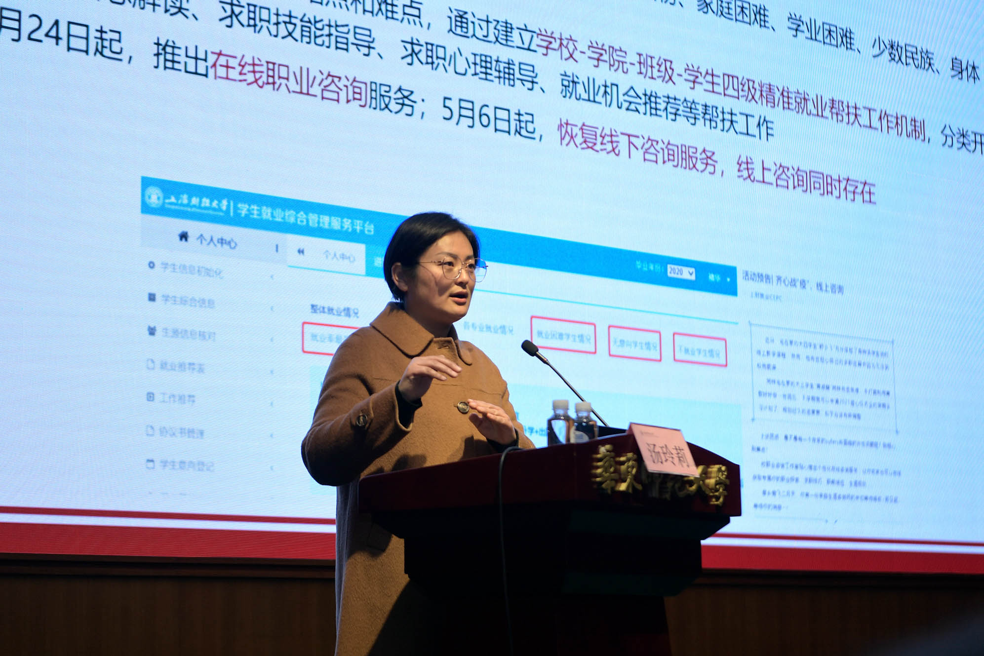 澳门永利皇宫官网入口党委副书记杨昌利首先为大会致辞。她指出,随着《中长期青年发展规划(2016-2025年)》出台,明确提出要达到青年就业比较充分,高校毕业生就业保持在较高水平;青年就业权利保障更加完善,青年的薪资待遇、劳动保护、社会保险等合法权益得到充分保护;青年创业服务体系更加完善,创业活力明显提升的发展目标。高校毕业生就业关系民生福祉、社会稳定和国家发展。2021年是“十四五”规划的开局之年,也是全面建设社会主义现代化国家新征程、向第二个百年奋斗目标进军的开局之年,做好高校毕业生就业工作,确保就业大局稳定,具有特殊重要的意义。
