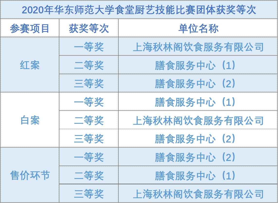 后勤保障部膳食服务中心(1)、膳食服务中心(2)、上海中快餐饮管理有限公司、上海秋林阁饮食服务有限责任公司等4家校内餐饮服务单位代表队24名选手参加了比赛,涵盖了两校区7个基本伙食餐厅的厨师、点心师和售菜计价人员,参赛作品共有16道红案、16道白案和出售服务环节(打菜和计价)。