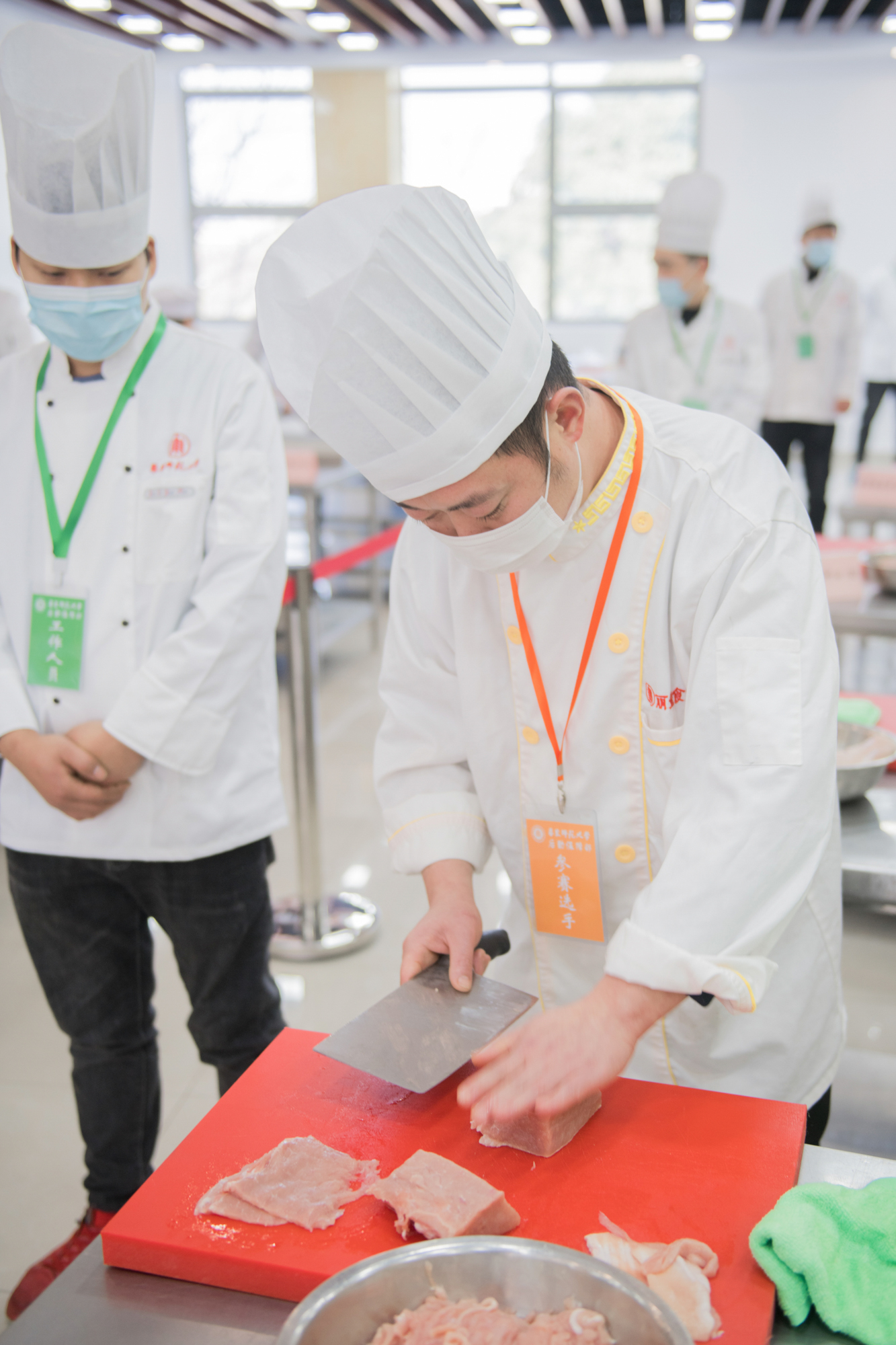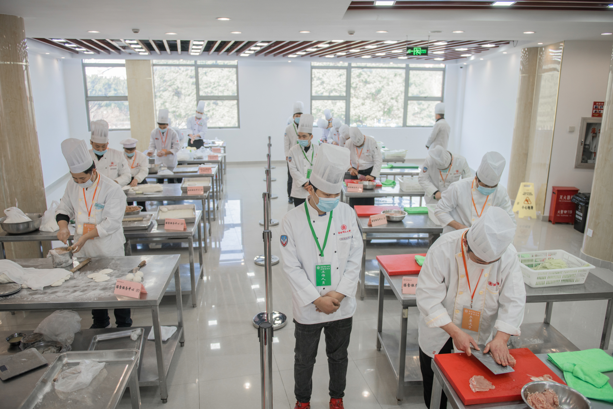 根据比赛规程,各代表队要在90分钟内完成4道菜(红案和白案各2道)的操作,要求参赛选手每道工序独立完成,从原材料切配、形状造型、上灶烹饪到成品,综合色泽、香气、调味、刀工、口感、营养等方面进行厨艺技能考量;出售环节则从打菜精准度和计价准确度进行考核。