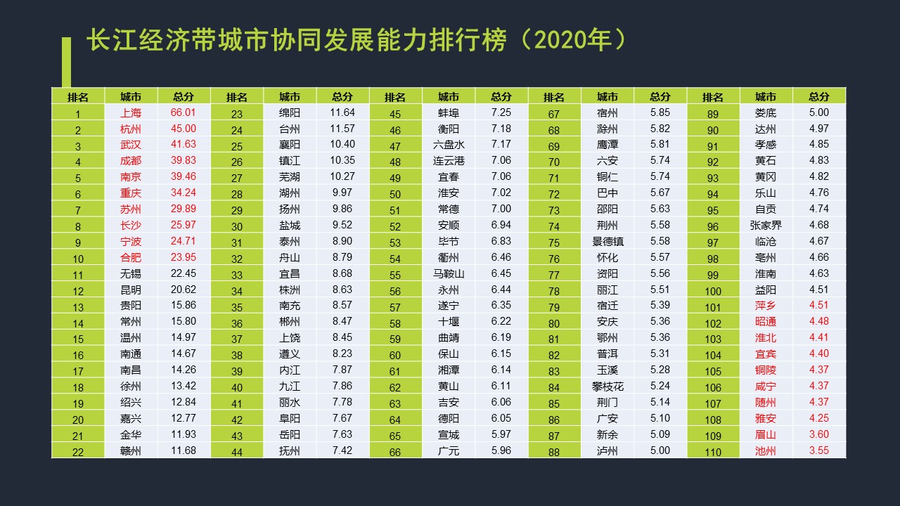 长江经济带城市协同发展能力指数(2020)表明,协同发展能力前十强城市依次为:上海、杭州、武汉、成都、南京、重庆、苏州、长沙、宁波、合肥。合肥首次跻身TOP10,无锡则因生态支撑能力欠佳(4.63分)首次跌出TOP10。南京则从2019年的第2名降为第5名;苏州继2019年跌出前三甲后,今年继续位居第7名。萍乡、昭通、淮北、宜宾、铜陵、咸宁、随州、雅安、眉山、池州则位列排行榜的后十名。