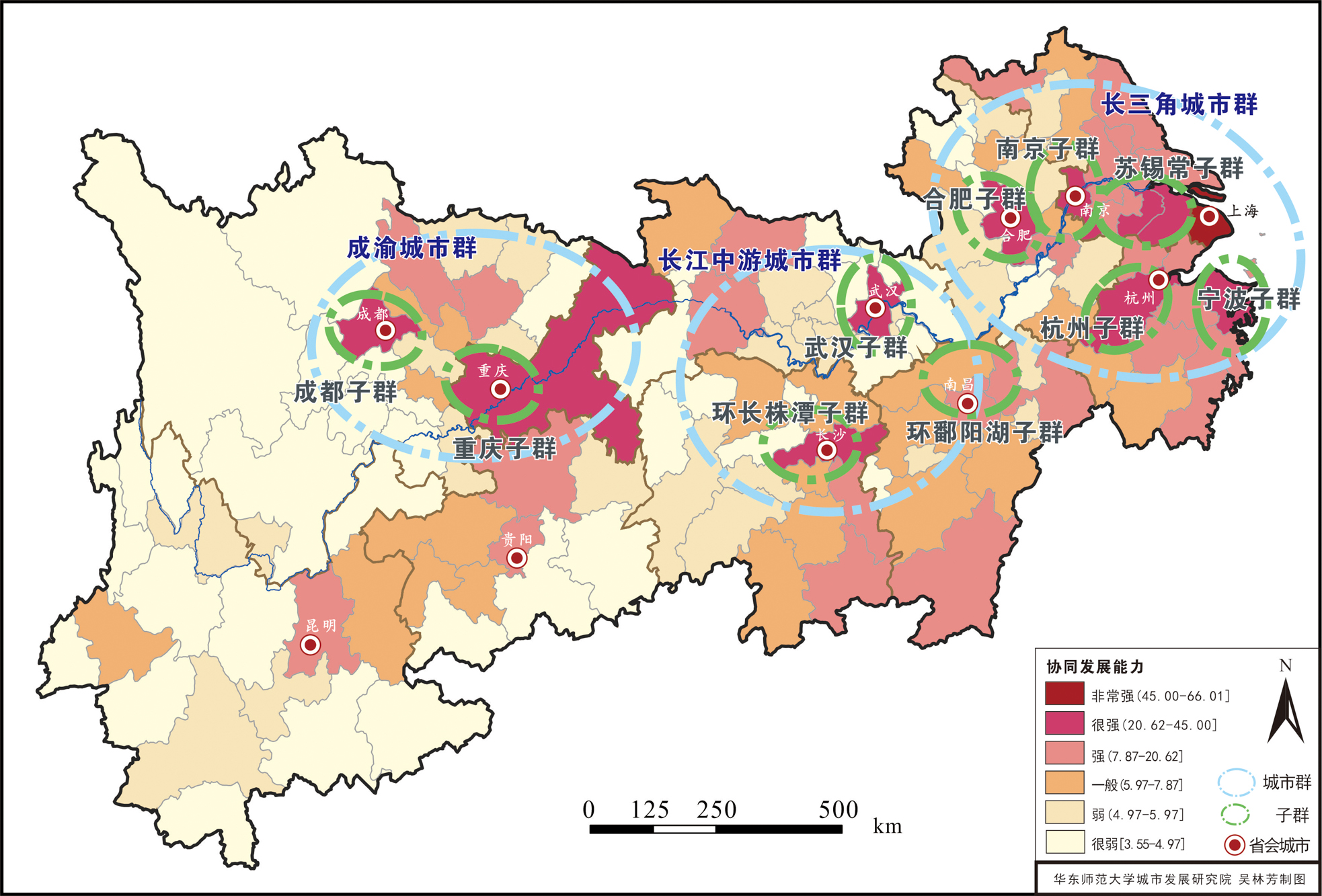 长江经济带城市协同发展能力城市组团分布图(2020)