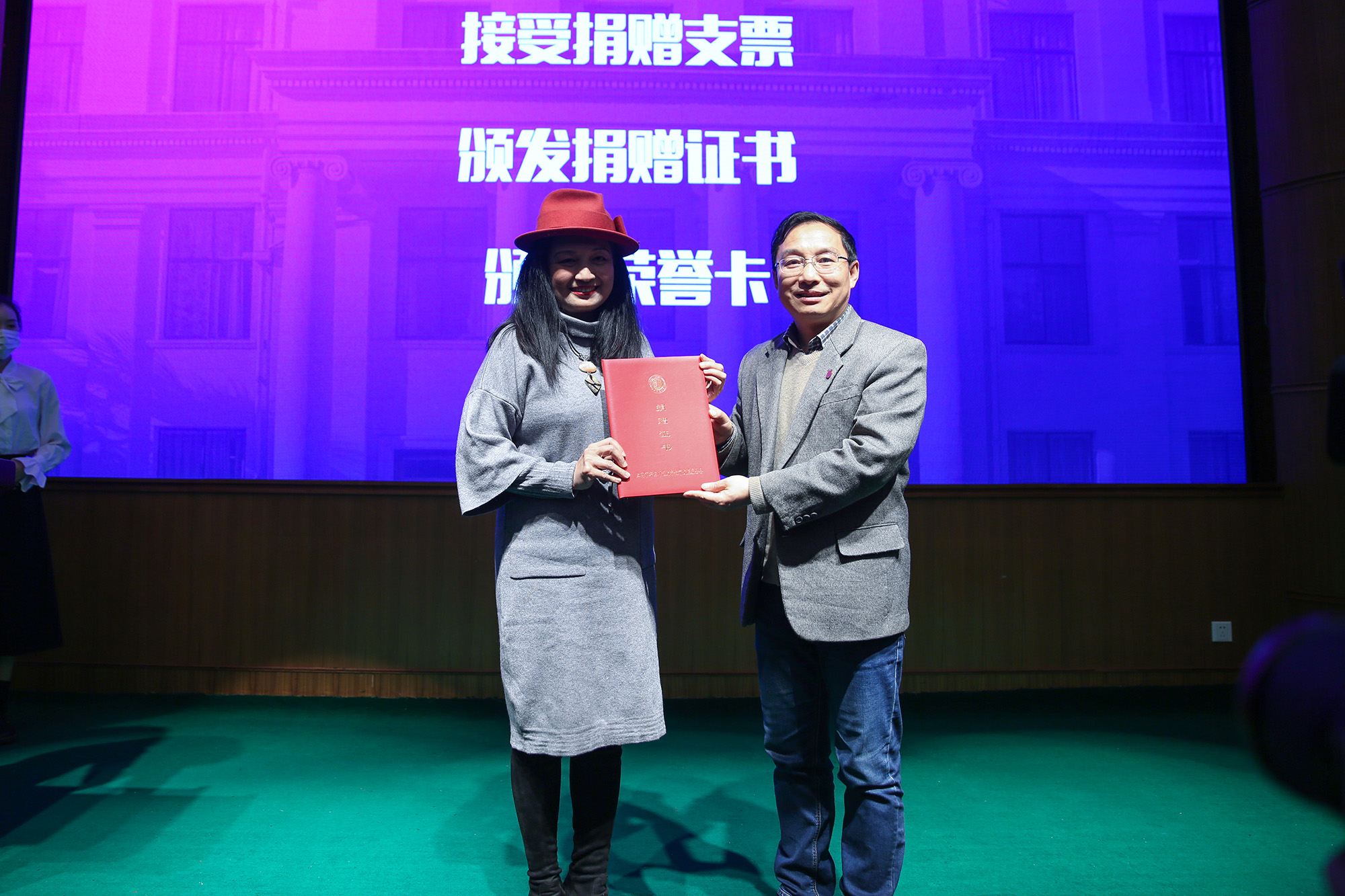 校长助理、教育发展基金会秘书长斯阳接受捐赠支票,并向安乔国际双语幼儿园园长苏淳莹颁发捐赠证书