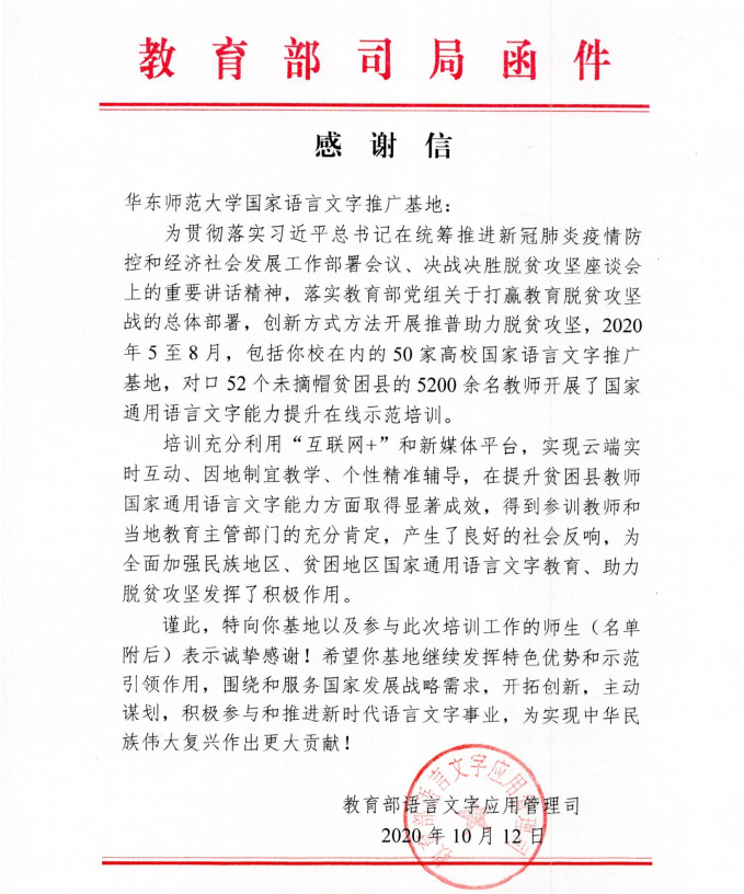 华东师大国家语言文字推广基地提交的项目获批教育部“2020年首批国家语言文字推广基地建设重大项目”
