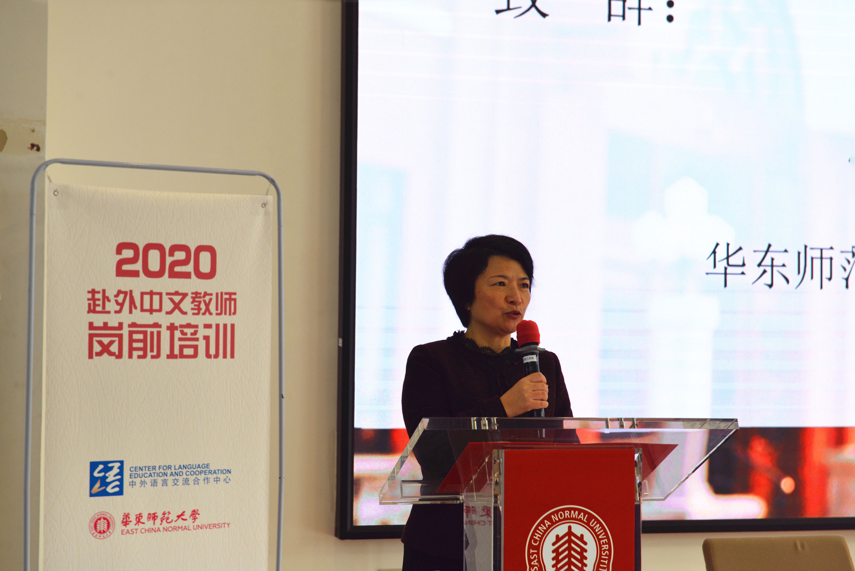 暖场片播放之后,开班仪式在庄严的国歌声中拉开帷幕。梅兵首先代表学校致辞,她对参加2020年首次线下培训的学员们热烈欢迎。她提及,刚闭幕的十九届五中全会为未来5年乃至15年中国发展擘画了蓝图,公布了既有前瞻性又符合实践需要的行动纲领,打开了世界感知中国脉动的最佳窗口。在这样的背景下举办培训意义深远。梅兵对语合中心的信任和支持表示诚挚感谢,对在座老师们在这特殊时期的“逆行”表达了崇高的敬意和美好的祝福。她介绍了刚刚度过69周岁生日的华东师大,作为新中国成立的第一所师范大学在学科发展及语言教育方面的特色,介绍了成立于2008年国际汉语教师研修基地12年的工作及取得的成绩。她希望大家在国际合作交流面临挑战的今天,能够克服困难,认真学习,承担好教授汉语、交流文化的重担,成为中国呈递给世界最好的名片。