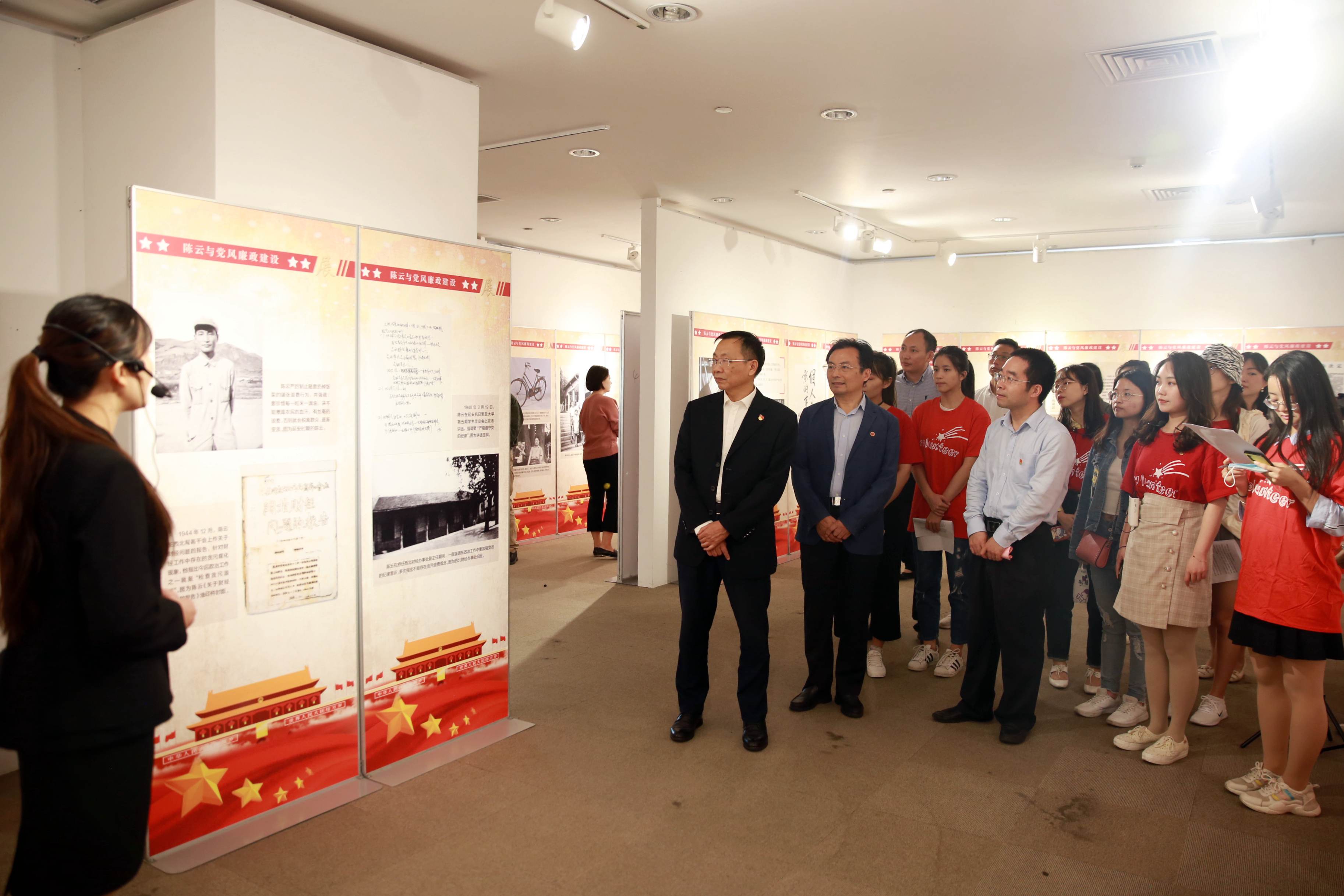 致辞结束后,曹友谊、吴瑞虎共同为专题展揭幕。参加开展式的师生在陈云纪念馆专业讲解员的带领下,一同参观了展览。