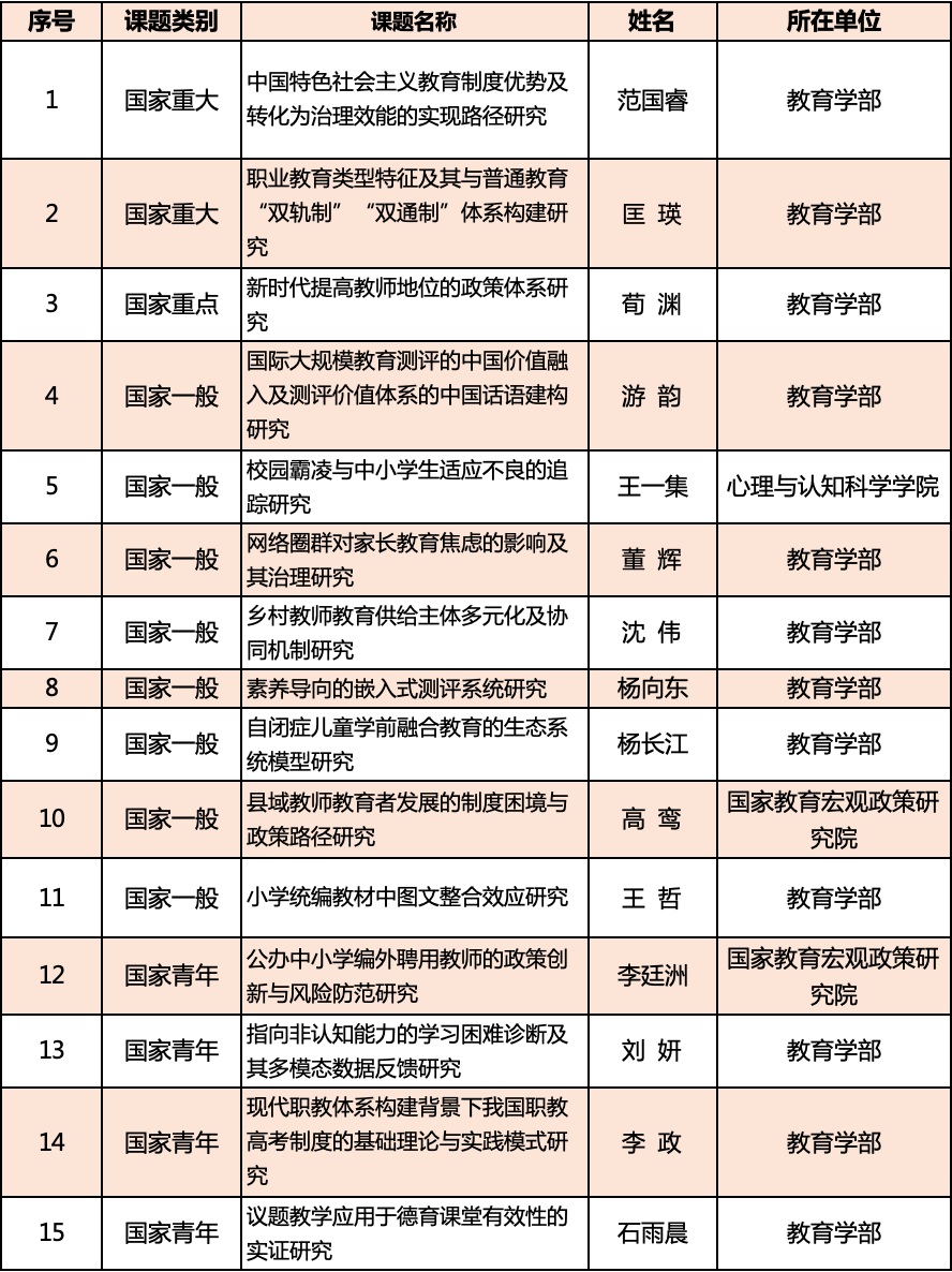 在2020年度国家社科基金教育学项目立项名单中,华东师大立项总数达15项,其中国家重大重点课题共3项,一般项目8项,国家青年项目4项,立项总数全国高校排名第一。此外,还获教育部重点项目2项。
