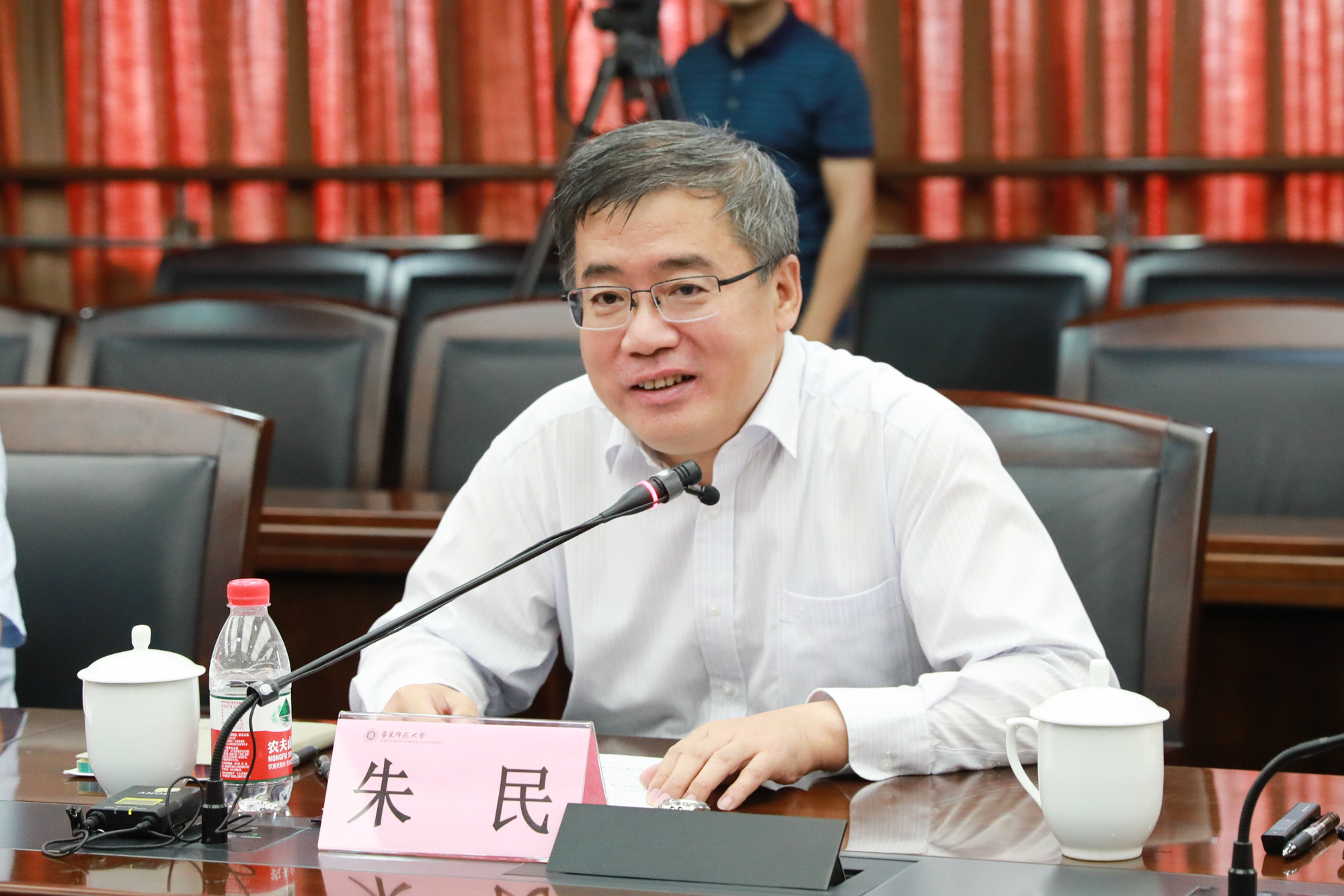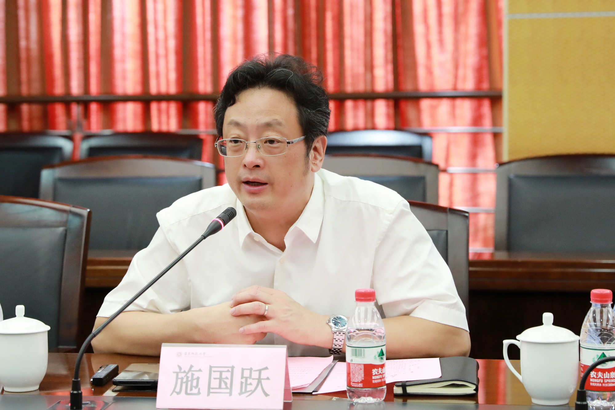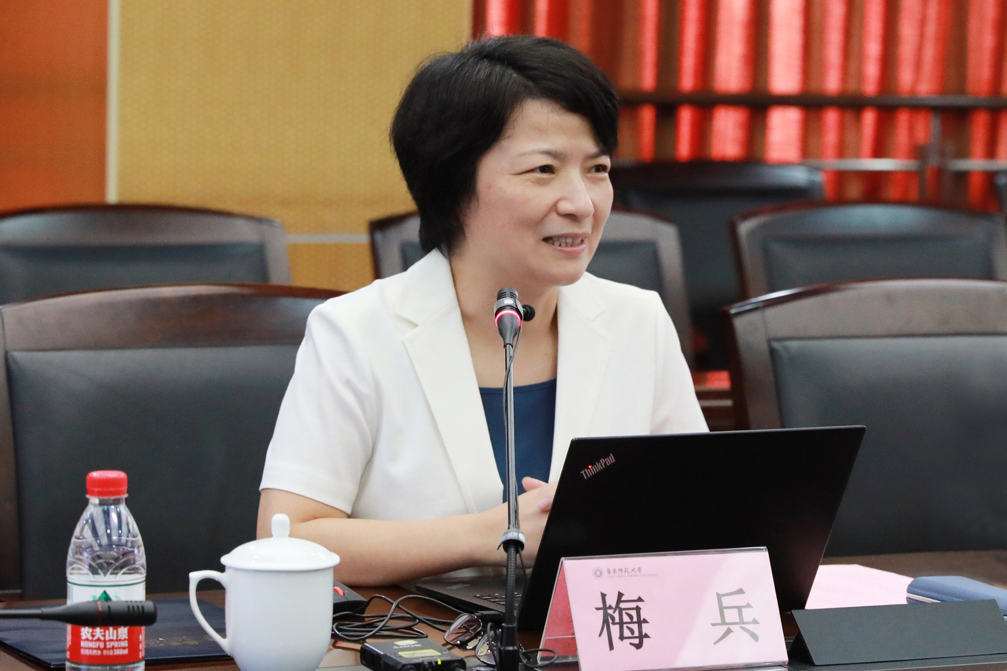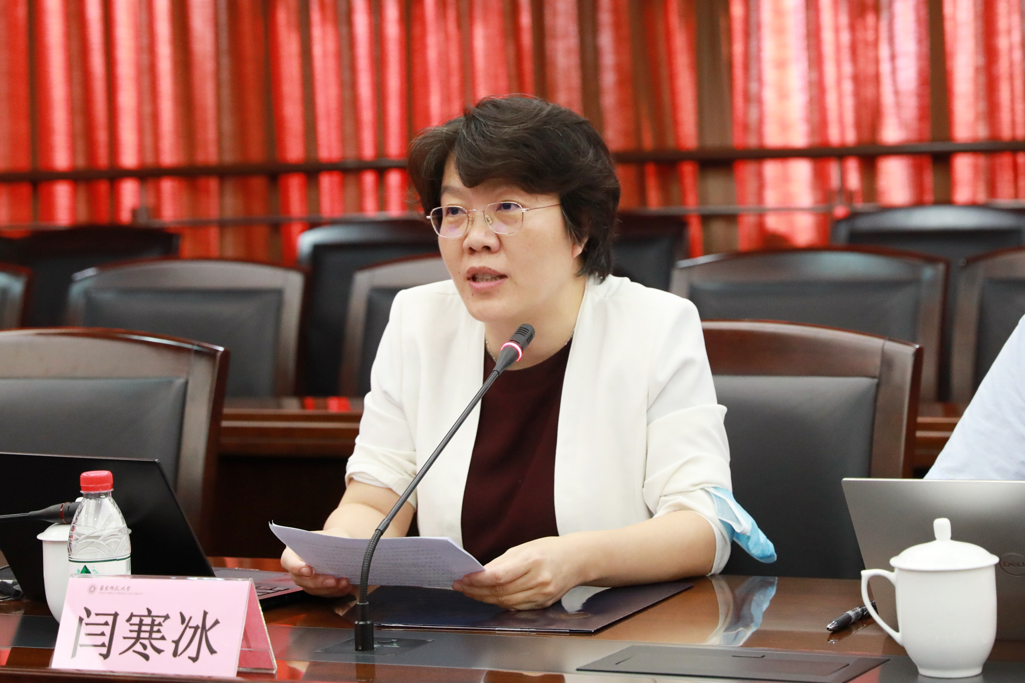 8月31日上午,华东师大第三十一期新入职教职工培训开班典礼在闵行校区办公楼403会议室举行。校党委书记梅兵、校党委副书记朱民,教务处处长孟钟捷,机关党工委书记王淑仙,教师发展学院院长闫寒冰,以及30位新入职教职工代表应邀出席开班典礼。典礼由党委教师工作部部长、人事处处长施国跃主持。基于当下疫情防控工作的有关规定,本次开班典礼采用线下和云端直播同步的方式进行,另有240余位新入职教职工通过“瞩目”视频会议平台在线参加了本次开班典礼。
