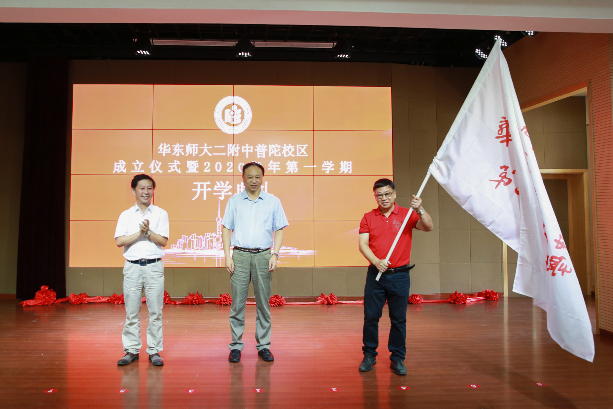华东师大副校长戴立益、二附中校长李志聪向普陀校区授旗