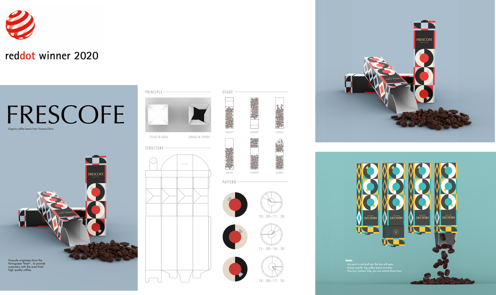 澳门永利皇宫官网入口设计学院产品设计专业本科生周效羽、环境设计专业本科生余彦毅的作品《Headphone Home》,MFA艺术专业硕士研究生黄锦飞、洪丽娟的作品《Frescofe》和刘智渊的作品《New Grape Packaging》一举夺得2020年度设计红点奖。