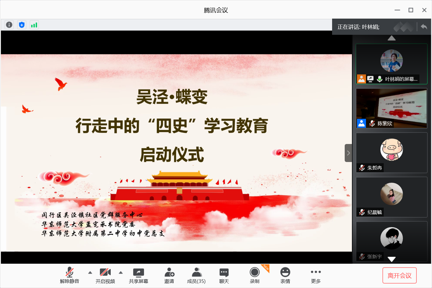 “五朵金花”调研项目组校内导师、华东师大孟宪承书院教师代表叶林娟在发言中表示,本次项目的实施内容主要包括体验、调研和党员微课三大模块,整个项目筹备过程中充分体现了党组织的引领和学生党支部的参与,希望书院的党员骨干们以“四史”学习教育为契机,增强学生党员教育培养效果,并发挥师范生特色优势,扎实做好“五朵金花”历史微课,在服务社会中实现成长。