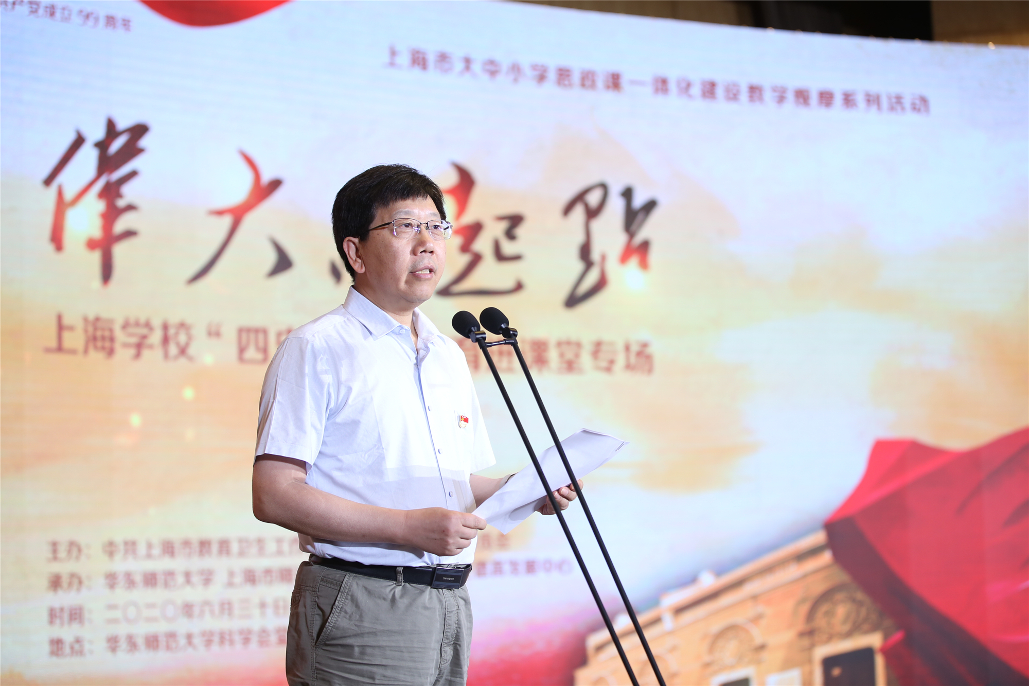 为庆祝中国共产党成立99周年,将“四史”学习教育引向深入,持续推进习近平新时代中国特色社会主义思想进课堂、进教材、进头脑,6月30日,“伟大的起点”上海市大中小学思政课一体化建设教学观摩系列活动暨上海学校“四史”学习教育进课堂专场在华东师大中山北路校区举行。本次活动由中共上海市教育卫生工作委员会、上海市教育委员会主办,华东师大、上海市师资培训中心、上海市学生德育发展中心共同承办。上海市大中小学生“四史”学习教育活动启动仪式之后,来自不同学段、学科的6位教师围绕“伟大的起点”主题同上一堂课,立体化展示了我市大中小学思政课一体化建设进展,呈现了党的红色基因融入和植根于青少年学生的发展过程。除了现场观摩学习的上海市大中小学师生,本次活动还通过央视频、目睹、华东师大直播平台同步网络直播,包括全市各区思政教研员、学校思政课骨干教师代表,全国重点马院以及华东师大对口支援合作高校马院教师及学生在内的1.2万余人线上线下共同观摩学习。