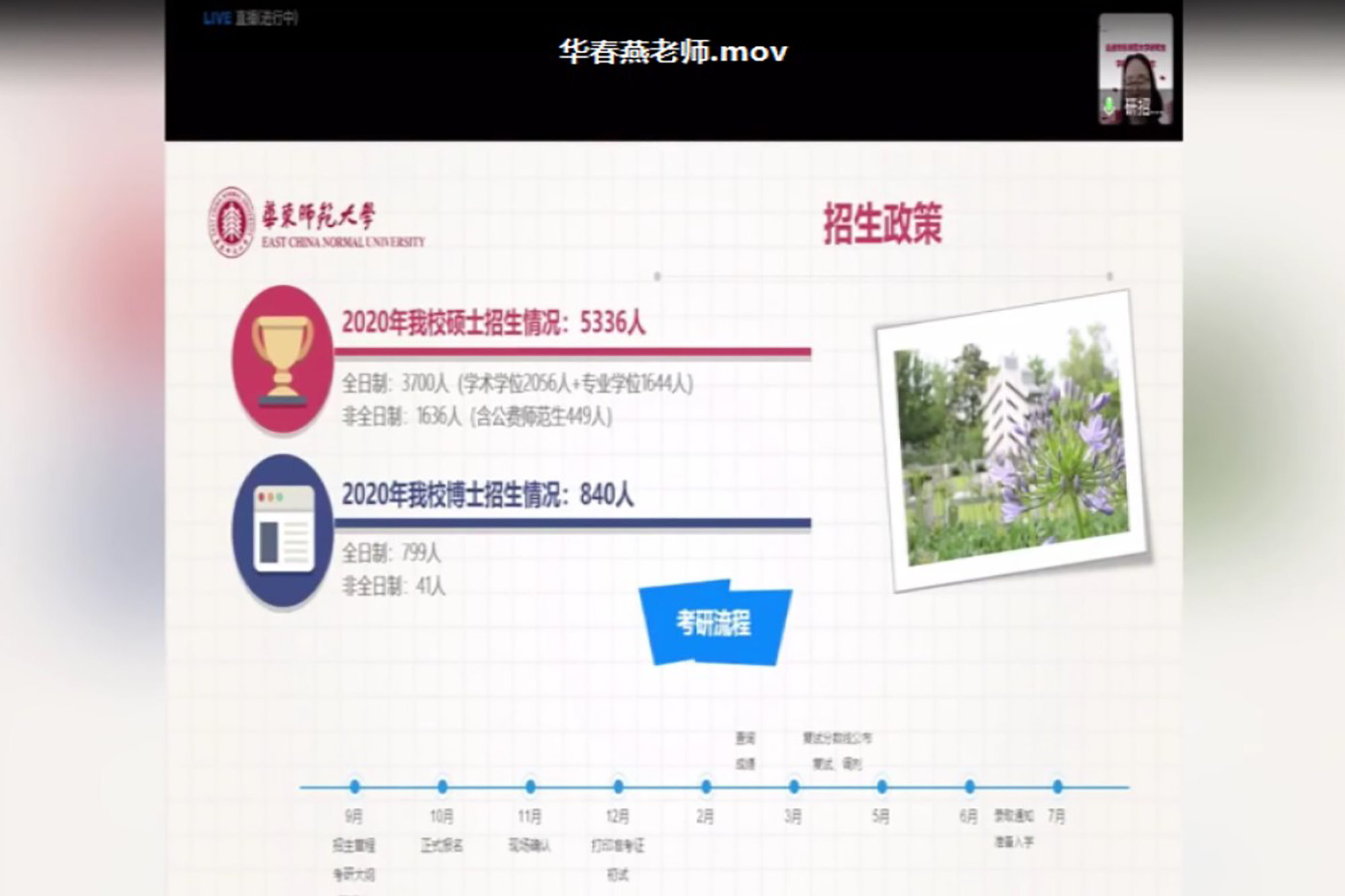 研究生招生办公室主任华春燕以《走进澳门永利皇宫官网入口硕士研究生:学科、培养与招生》为题,从华东师大学科概况、研究生培养和资助体系、国境外交流项目、研究生招生政策等方面做了介绍,让广大学子有了更具象化的概念。她提到,华东师大坚持立德树人根本任务,以“服务需求、提高质量、追求卓越”为主线,努力全面办好一流研究生教育,切实推进研究生教育高质量创新发展,目前已有12个学科进入教育部第四轮学科评估A类。