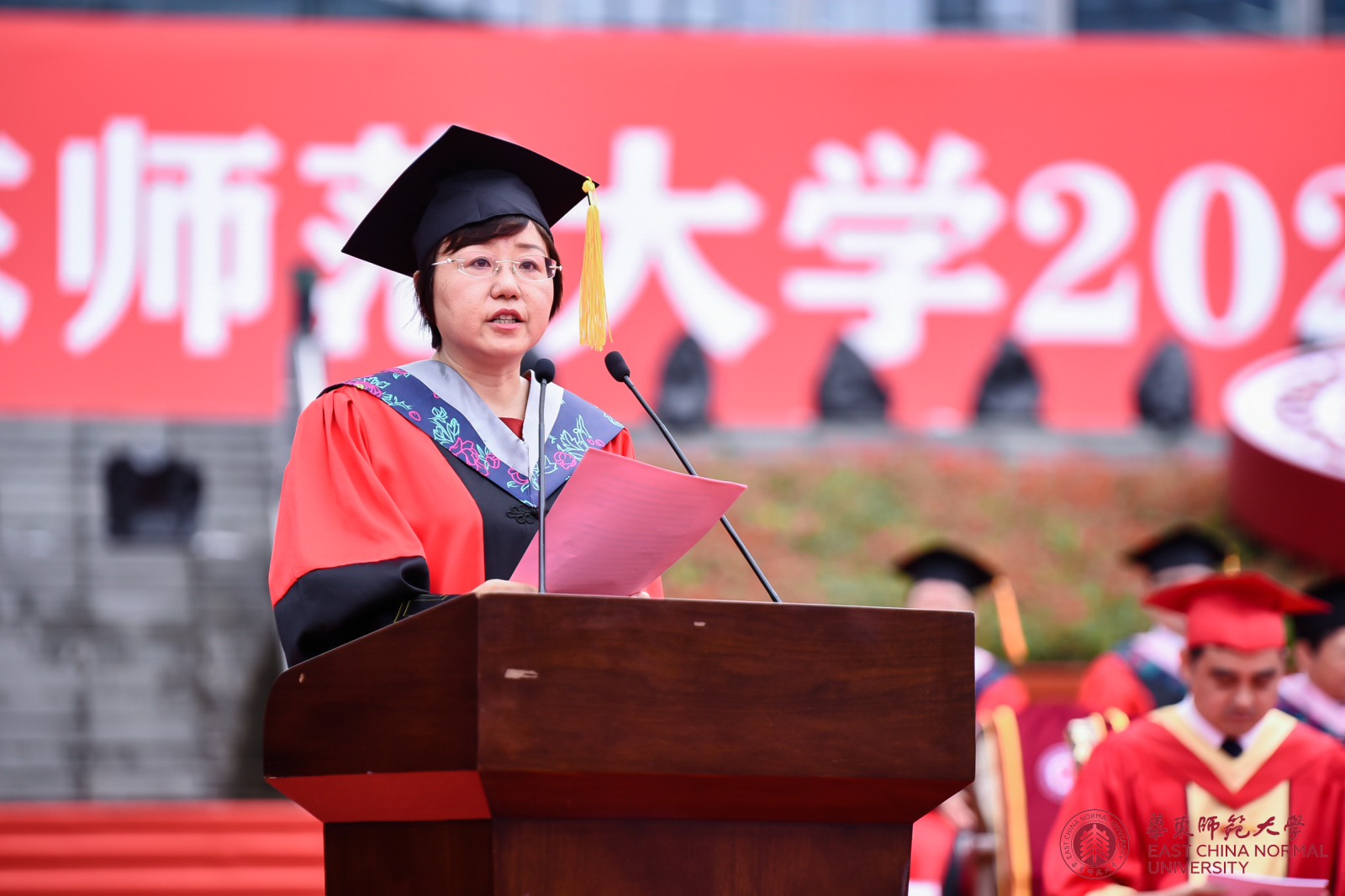 化学与分子工程学院院长田阳作为教师代表,结合其研究的专业生动地展现了一个科学研究者对于学术事业的热爱,也诠释了韦伯所言的“学术作为一种志业”,她以自己的学术体验和生命经验告诉毕业生们,真善美是人生的最高境界,希望即将走上新岗位的同学们要善于发现美,时常感恩美,勇于创造美。田阳引述罗曼·罗兰的话说:“‘世界上只有一种真正的英雄主义,那就是认清生活的真相后还依然热爱生活。’在国家民族历史发展的进程中,自大夏大学、光华大学开始,华东师大人始终以天下兴亡为己任,以自强不息为传统,一代又一代品德高尚、视野开阔、具有厚重人文精神和科学素养、敢于担当的栋梁之材从这里启程。”“一个人最重要的,不是他的位置而是他的方向。”田阳风趣地说道,石墨柔软,滑腻留痕;钻石坚硬,光彩夺目。石墨和钻石外形天壤之别,但具有相同的“质”,都由碳元素组成。她衷心期待毕业生们勇于追求真、善、美,给理想多一份坚守和忍耐,终将成为有趣的灵魂,收获美好的人生。