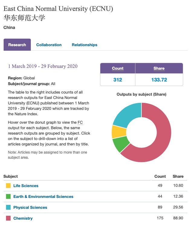 自然指数于2014年11月首次发布,目前已成为评价科研机构高水平学术成果产出的重要指标。自然指数主要对前一年各科研机构在Nature系列、Science、Cell等82种自然科学类期刊上发表的研究型论文数量进行计算和统计。82种来源期刊分为化学、地球与环境科学、生命科学和物理学四类。以分数式计量(FC,fractional count)法计算全球各大学/机构对自然科学的贡献度(Share)。