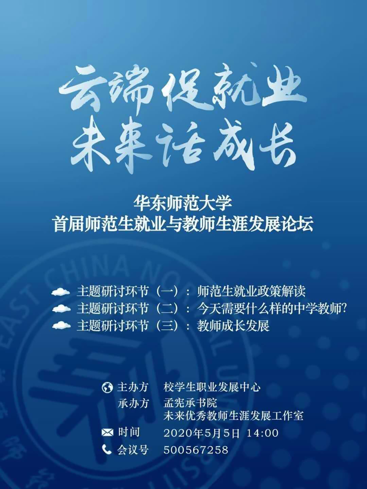 为提升未来教师的综合素质,增强师范生的未来适应能力,结合当前做好“稳就业”的工作要求,由华东师大学生职业发展中心主办,孟宪承书院及未来优秀教师生涯工作室承办的“澳门永利皇宫官网入口首届师范生就业与教师生涯发展论坛”5月5日下午在线举行。上海市教育人才交流服务中心主任江明、上海市教育委员会学生处副处长吴能武、重庆市第八中学党委书记卿知人、上海市徐汇中学校长曾宪一、合肥市第一中学陈起标、澳门永利皇宫官网入口第二附属中学潘捷、南昌市第二中学詹璐以及华东师大学生工作党委书记兼学生工作部部长余佳、孟宪承书院党委书记兼院长吴薇、学生职业发展中心主任刘继亮等来自上海就业主管部门负责人、全国知名中学校长、基础教育届资深专家、骨干教师,与300余名应届毕业生、在校大学生,围绕“云端促就业,未来话成长”主题共话师范生就业与教师生涯发展。论坛由华东师大孟宪承书院党委副书记万姗姗主持,本届论坛也是华东师大对接湖北文理学院一对一就业帮扶活动、就业服务月系列活动。