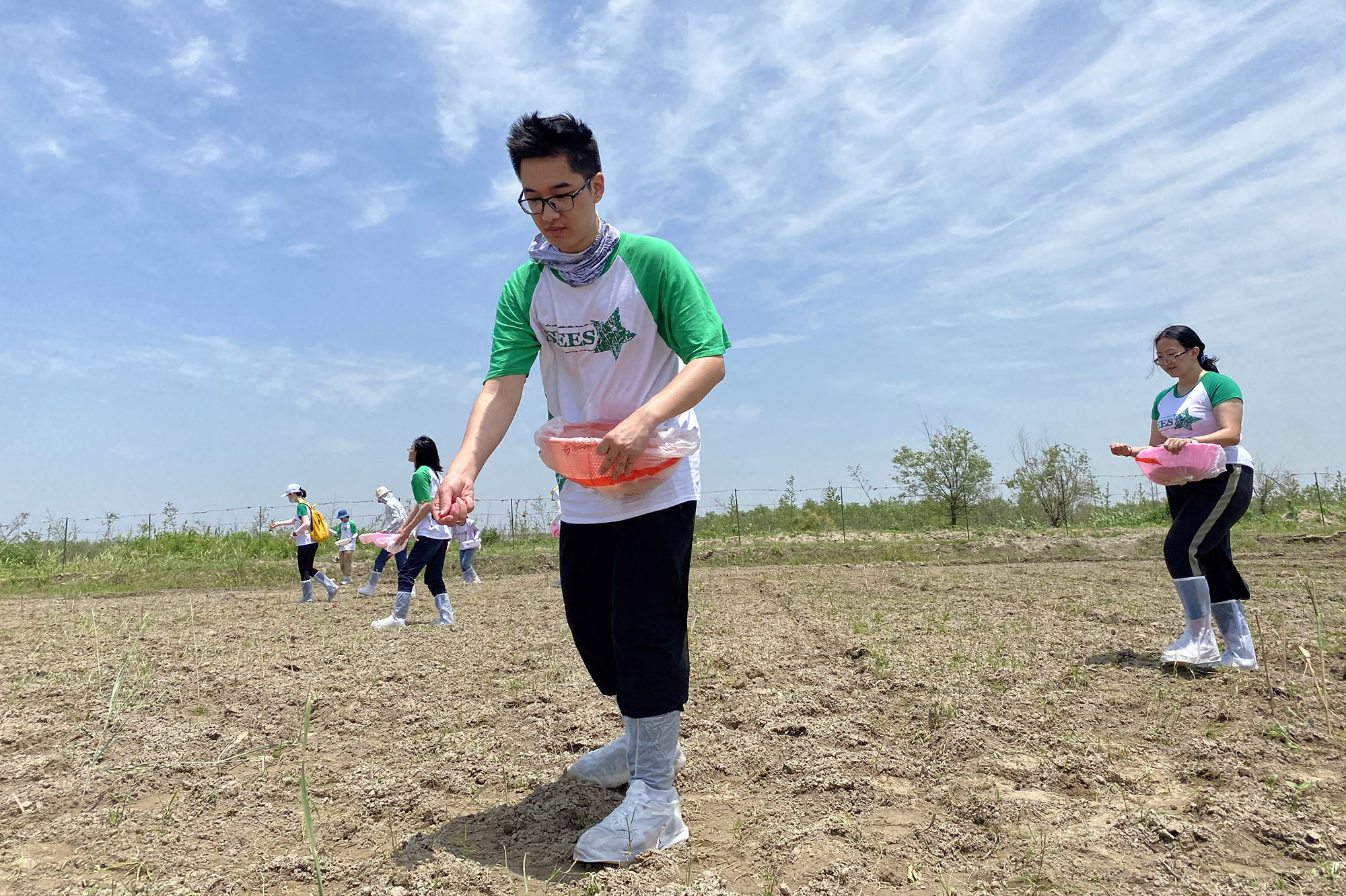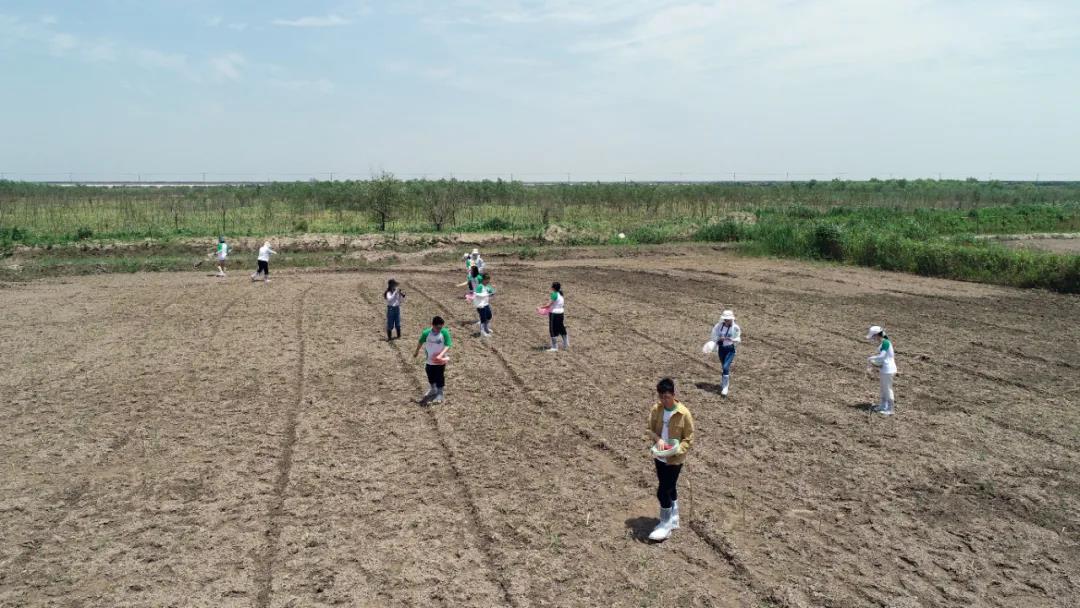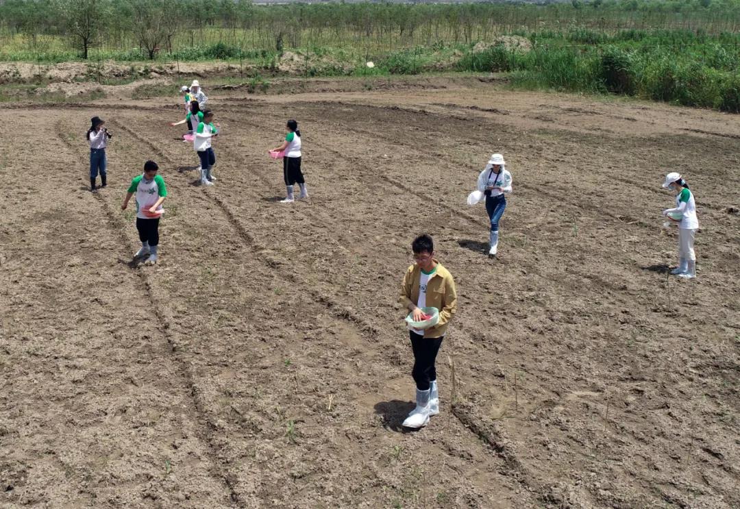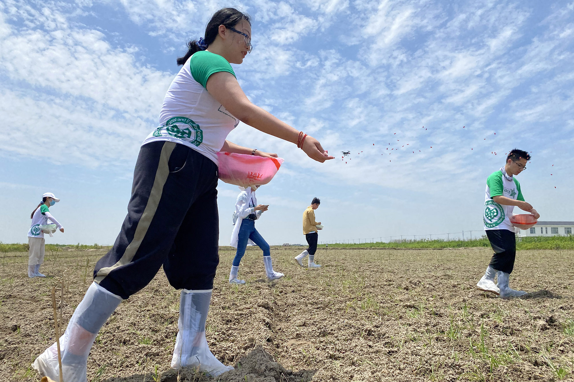 在当地农户的指导下,同学们采用旱地直接播种法,将育好芽的种子,均匀播撒在这片特殊的科研田上。同学们捧着种子筐,一把抓起少许种子,手臂一扬,手指一松,“漫撒”播种。播种均匀是漫撒技术的要点,别看这个动作简单,要想将种子撒得均匀,可是一件技术活。同学们通过亲身实践,迅速掌握了播种要领。