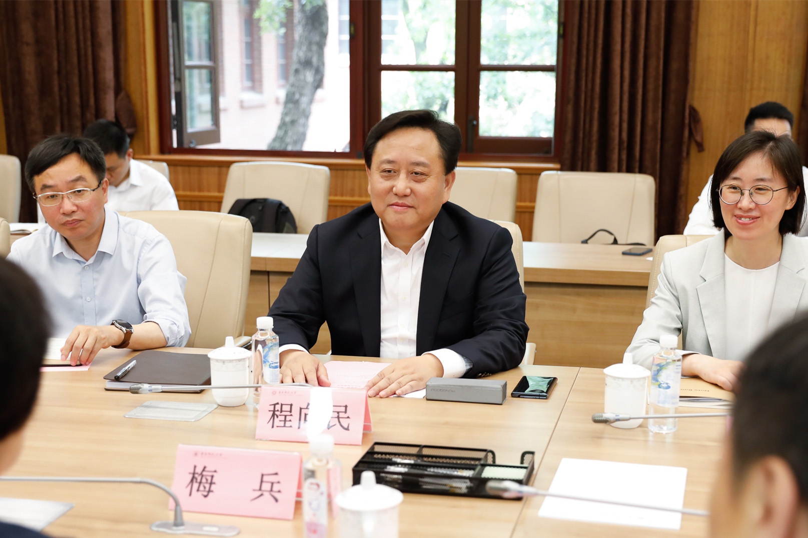 5月27日上午,松江区人民政府-澳门永利皇宫官网入口举行区校合作交流座谈会。华东师大党委书记梅兵会见了来访的松江区委书记程向民一行。座谈会由副校长戴立益主持。松江区副区长顾洁燕,华东师大二附中校长李志聪等出席会议。