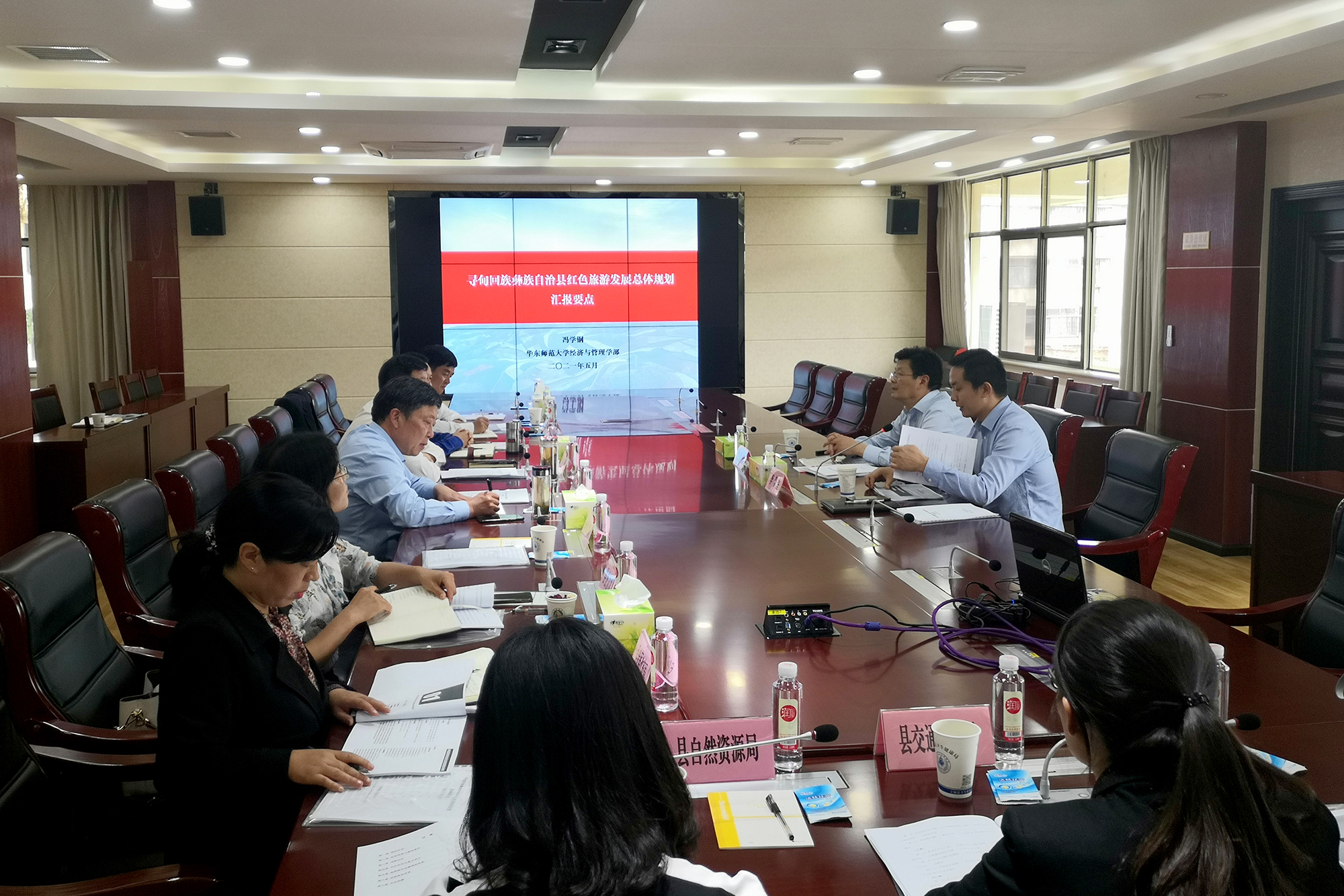 当天下午,华东师大专家学者们立即投入工作,分别到专业对口部门开展调研、咨询与服务。寻甸县委副书记、县长马郡参加冯学钢教授主持的“寻甸县红色旅游发展规划”研讨论证会,寻甸县委常委、县委宣传部部长龙晶晶率队与吕新雨教授围绕双方战略合作事宜进行深入交流。