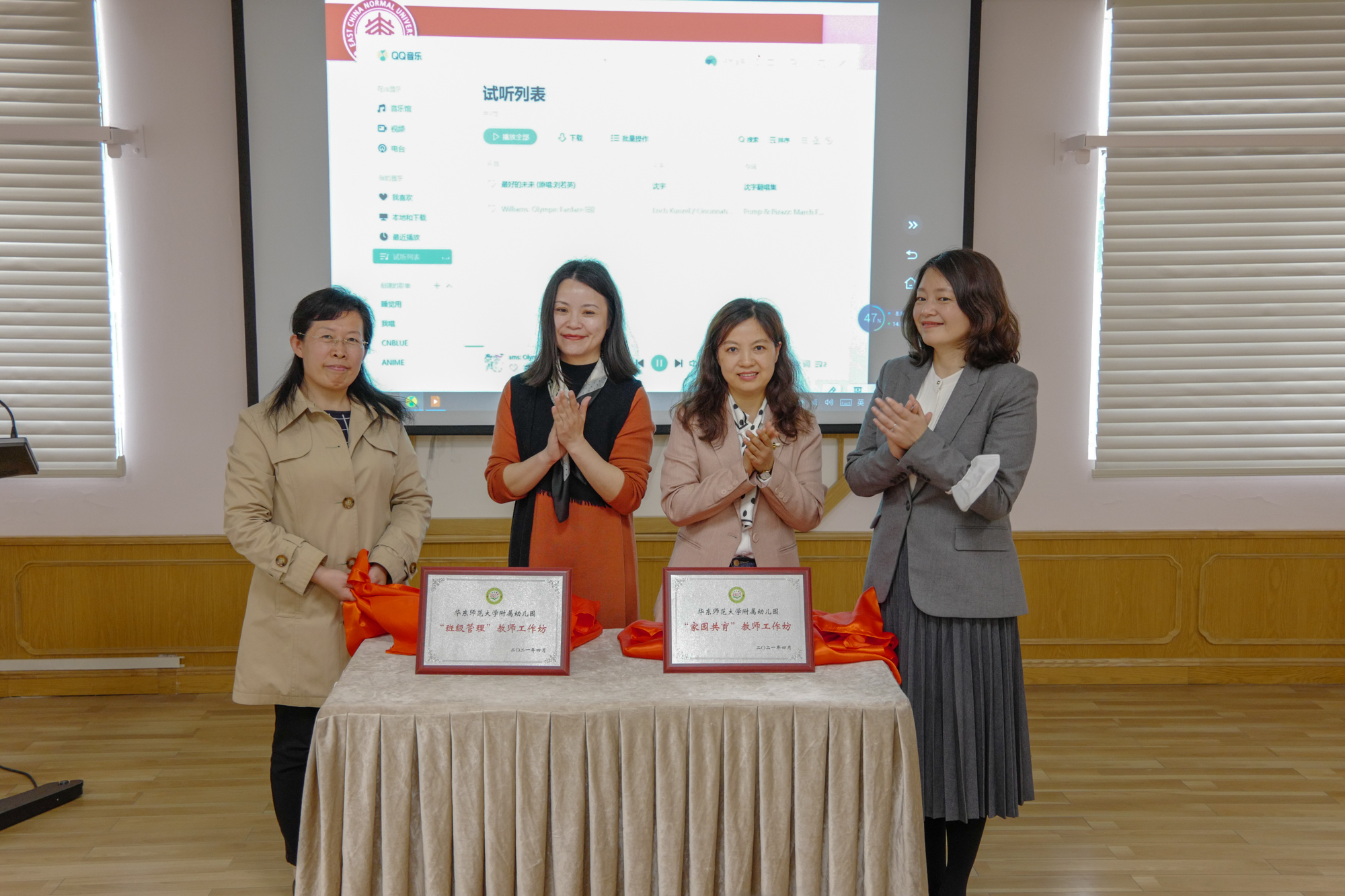 本次活动同时启动了附属幼儿园“家园共育”“班级管理”工作坊, 学前教育系副教授左志宏作为工作坊指导专家,通过视频方式表示祝贺。刘萍、李玉华、季云飞与工作坊的两位主持人吴丹、附幼大教研组长傅丽娜共同揭牌。