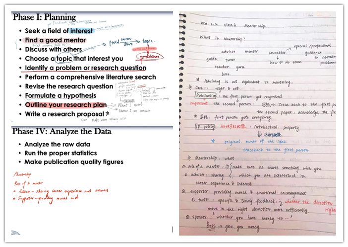 课程设置了“协作环境下的科研行为”主题,引入了科研项目中合作的重要性以及合作对象的选择等内容,安排了专题研讨、案例分析,将不同专业背景、不同语言能力的学生穿插分组,在每组组长的带领下,成员们充分发挥自己的学科优势与个人专长,互帮互助,提高学习效率,尤其针对课堂内容和课后作业展开了频繁、积极的探讨,每个小组每两周都会提交学习反思报告,巩固每一个阶段的学习研究。通过全程合作,同学们强化了研究团队意识,成员各司其职,成员间及时交流,积极融入团队。
