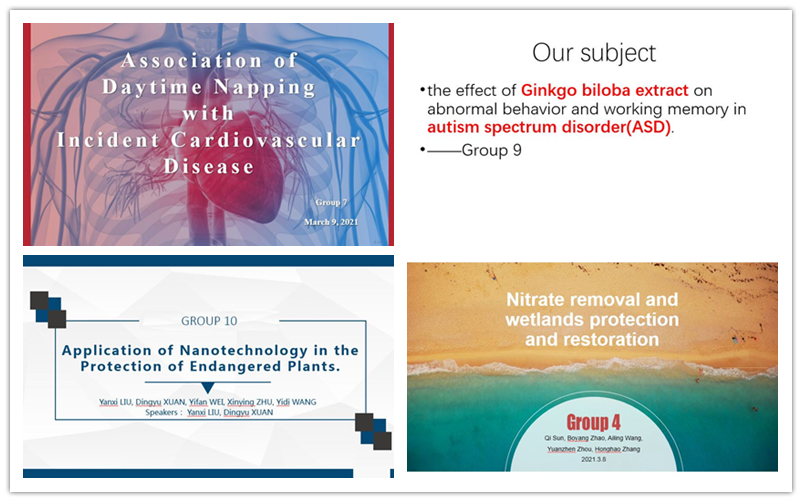 结业的presentation考核,每5名来自不同专业的学生组成小组,借助前7周所学科研理论、方法与技术,集思广益,共同设想、制定研究课题,过程中时常碰撞出思维的火花。最后一周以小组展示形式,将课题的研究价值、研究方法和预期结果进行展示,由外方项目团队根据每位组员展示的清晰程度、信息质量和组织水平进行评估。同学们所制定的研究课题富有意义和建设性,如纳米技术在濒危植物保护中的应用、肠道菌群和中药及二者结合对于抑郁治疗的作用、上海地摊经济规划的实践性研究、图书馆剔旧机制等。最终,在精彩的呈现之后,各小组都较好地完成了所有学习与研究任务,通过了项目考核,美方项目团队对华东师大学生作出了很高的评价。