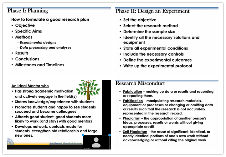项目教学团队由加州大学戴维斯分校工学院、微纳米创新实验室(MiNI Lab)主任Dr. Tingrui Pan领衔,戴维斯分校的多位教授、学者主讲课程、讲座。从理科科研的特点出发,通过循序渐进式学习,帮助学生了解美国的科研体系,形成国际化科研理念与思维;设置了科研领域的导师制、如何挑选科研课题、数据的采集与分析、如何撰写研究摘要、论文写作与发表等多个高质量的主题,使学生多方位、系统化地掌握科研过程的各环节,了解研究方法与手段,强化科研训练;并提升运用专业技术解决研究过程中实际问题、在全英文环境下获取传递信息的能力。教师来自不同专业,其中不乏从事交叉学科研究,教学内容打破了学科壁垒,关注的不是特定专业的知识传授,而是研究思路与方法,鼓励学生不拘泥于本专业的思维方式,与来自不同学科背景的教师、专家学者和同学沟通,阅读涉及多学科的科研文献资料,培养跨学科思维与研究能力。作为项目的另一特色,教师详细介绍了学术规范和知识产权方面的内容,加强了“未来科研工作者们”的学术诚信素养养成教育。