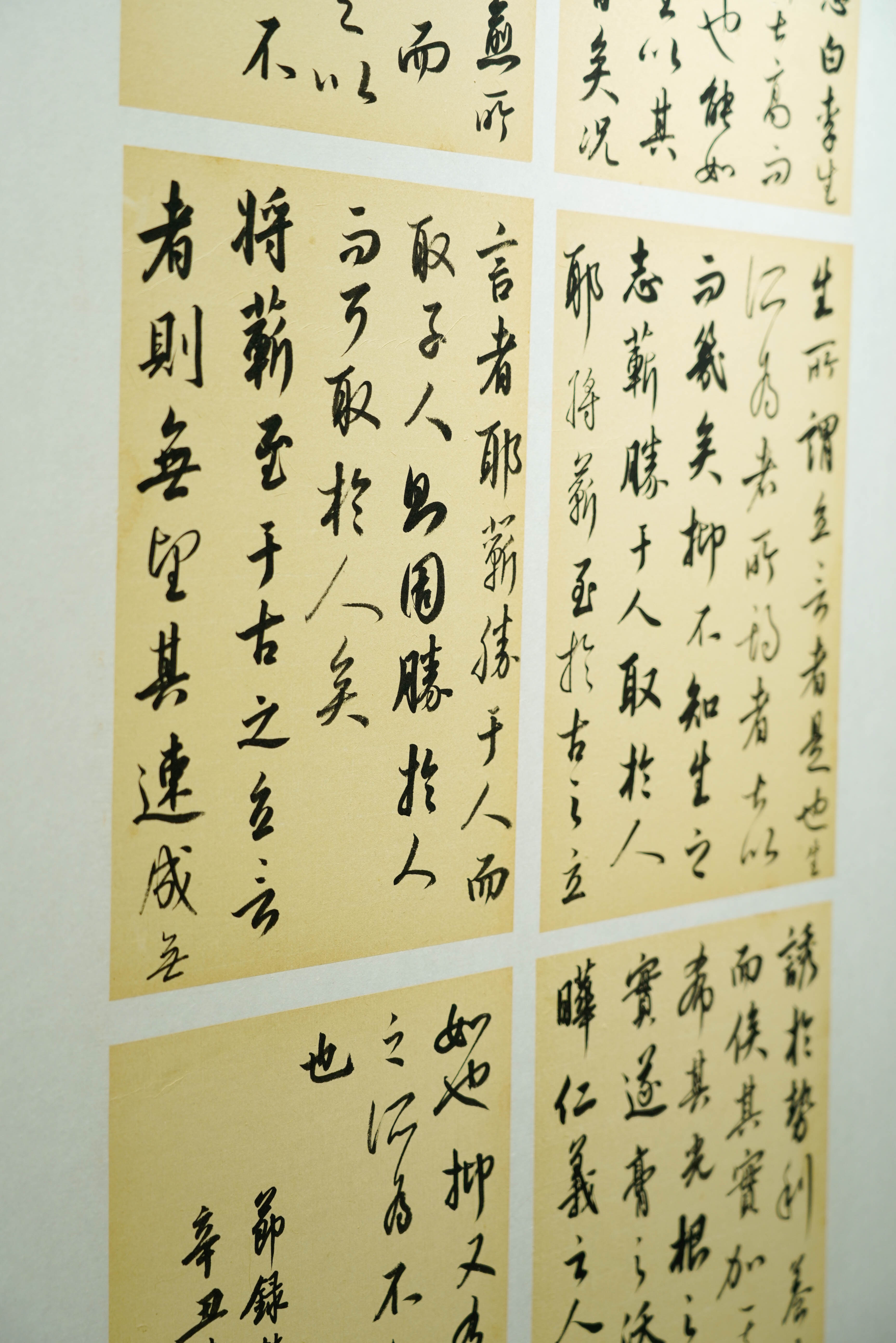这些临摹作品,装裱成十个手卷,陈列在临河边的樱花树下120米的展柜中,旨在与全校师生共同分享《兰亭序》的经典姿态,共同交流书法的学习心得,吸引了众多学子驻足欣赏。