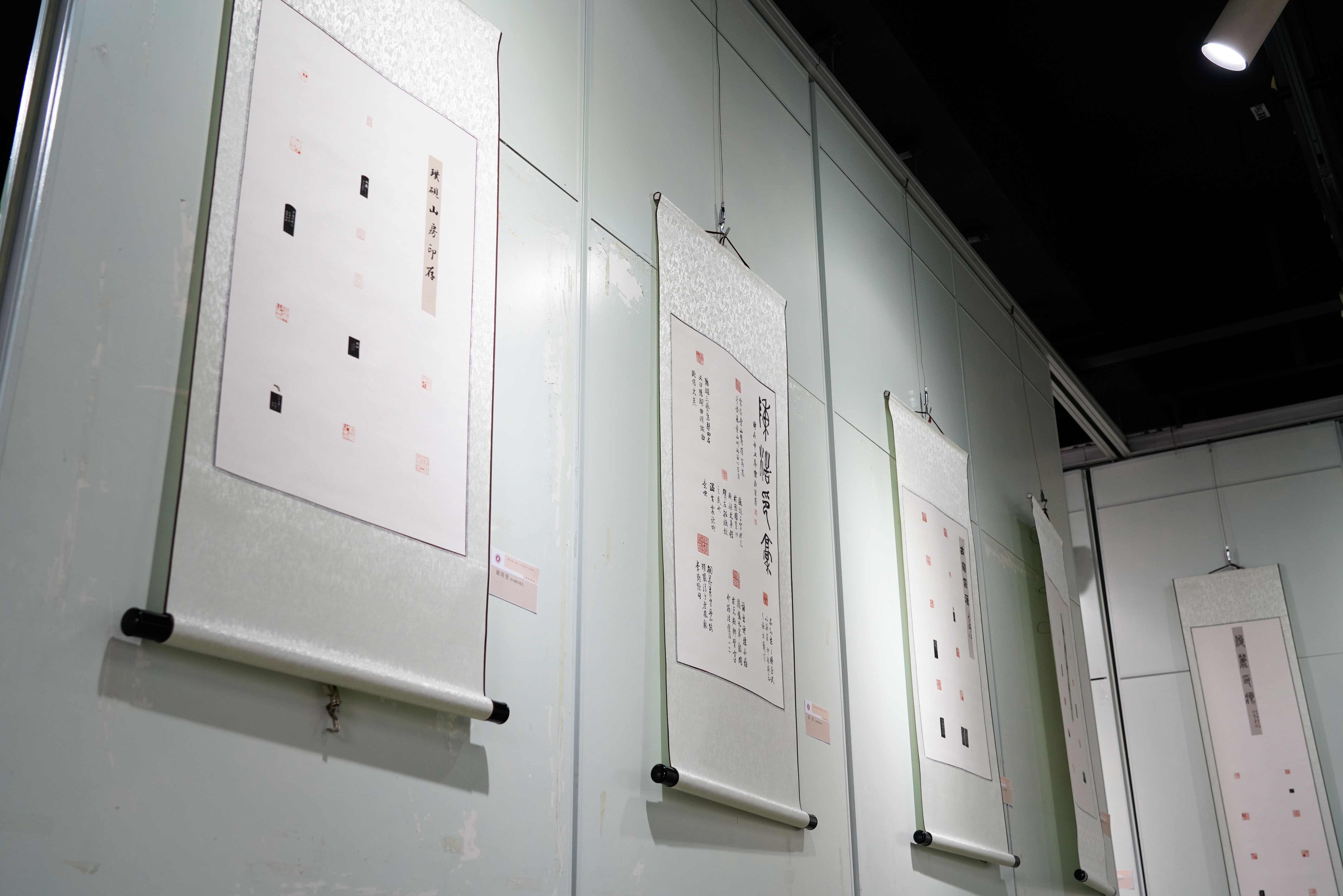 此外还有主题为“印证时代”的篆刻专题展。自去年华东师大篆刻传承基地落成以来,开展了一系列篆刻活动,在校园里掀起了一阵篆刻热潮。此次“印证时代”篆刻展是以建党100 周年为主题进行的专题展,通过作品,能够看到同学们对时代的歌颂与祝福。如郑瑾纶同学用铁笔镌刻下“人民当家做主”“工人阶级先锋队”的时代声音;孙瑾同学用铁笔碰撞出“战斗堡垒”“为万世开太平”的青年力量,体现出积极的精神面貌。展厅中有28幅印屏,其中“红色”主题篆刻有50余枚。各种状态的展示手段和方法在这里也得以体现,在现场能够感受到同学们完备的创作能力和多样的风格,以及对篆刻艺术的执着。
