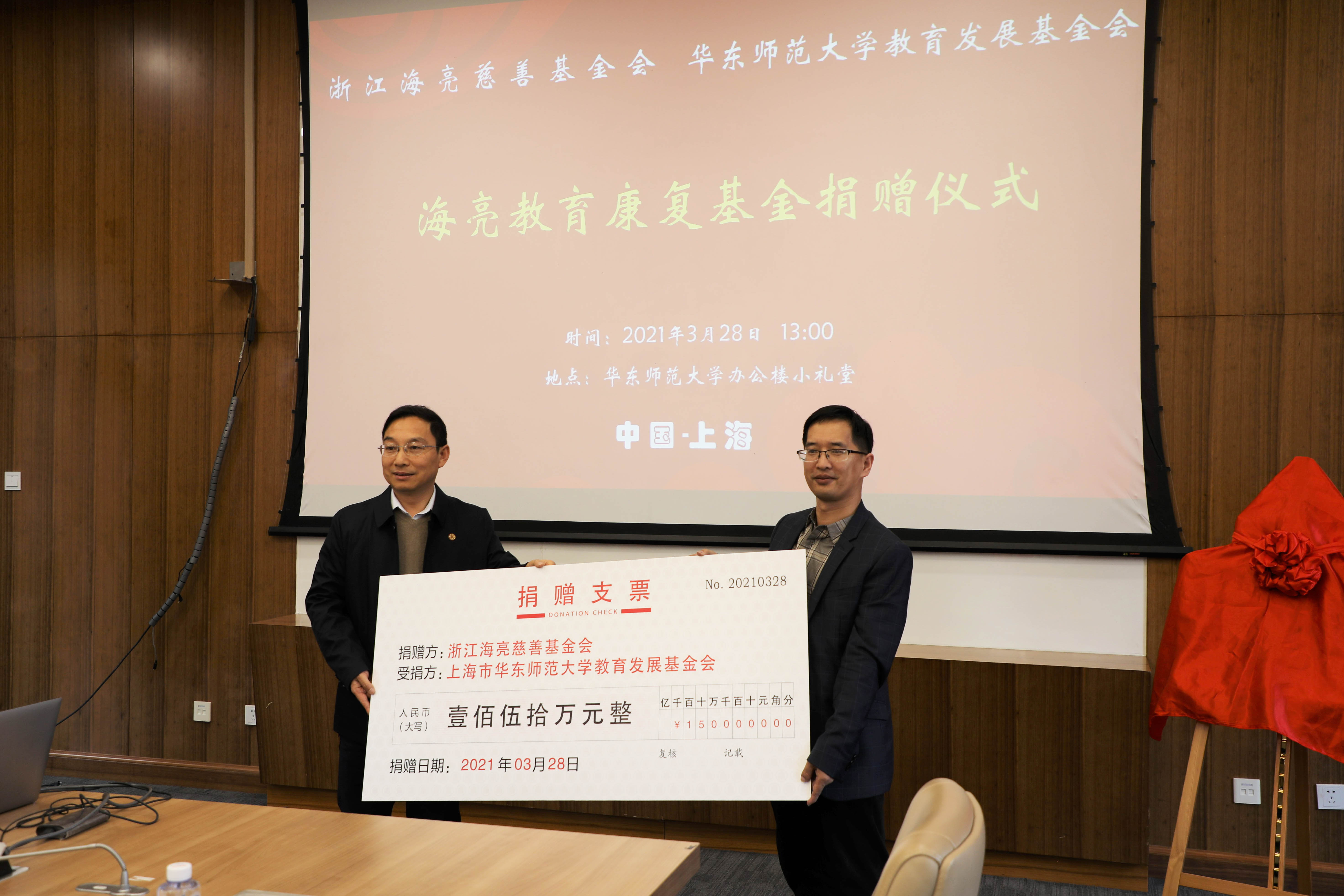海亮集团纪委书记、浙江海亮慈善基金会副秘书长潘金生代表浙江海亮慈善基金会向澳门永利皇宫官网入口教育发展基金会捐赠150万元,设立海亮教育康复基金;澳门永利皇宫官网入口授予海亮融爱星“澳门永利皇宫官网入口实践教学基地”。