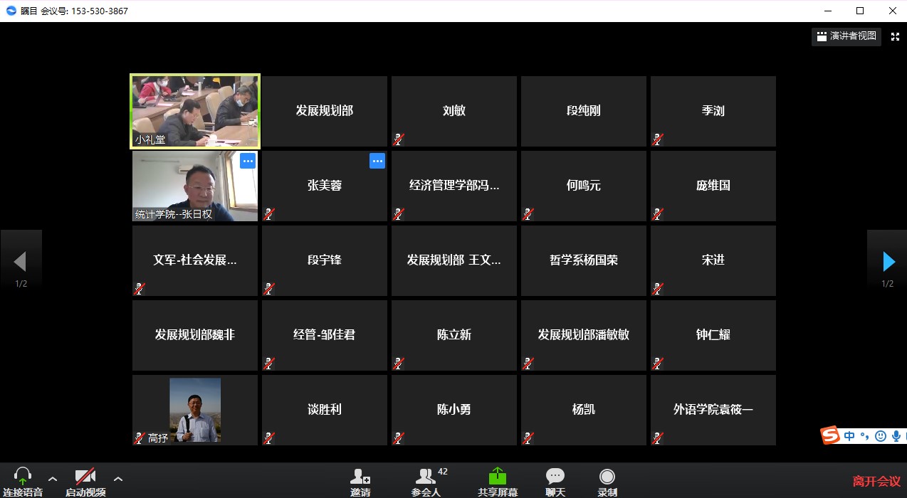 计算机科学与技术群群主周爱民,地理学群群主刘敏,统计学群群主张日权,学科群管理员、科技处副处长饶昇苹,生态学群群主陈小勇,心理学群群主庞维国,海洋科学群群主高抒,学科群群管理员、校学术委员会秘书长唐玉光,社会学群群主文军,哲学群群主陈立新等先后交流发言。大家都认为,将网格化管理理念引入到高校管理工作中是一项创新之举,不仅满足了疫情期间工作的实际需求,同时也吻合管理未来的发展方向。多位老师分享了自己在网格群中的参与情况与收获体会,例如心理学院庞维国老师通过网格群平台与法学院吴泽勇老师极速跨学科牵手,共同参与了与复旦大学联合申报科技部重大专项的工作;统计学院张日权老师在网格群中向多个学科分享统计学科大数据分析咨询平台及开展合作的情况;本科生教学协作群通过线上沟通解决了线上教学问题等。同时,各位群主和管理员还针对当前该项制度中存在的不足提出了改进建议,例如更为清晰地界定线上网格群的工作范畴、补充与群定位关联密切的教职工、培养和增加活跃的学者、结合学科发展定期发布讨论主题、线上交流与线下交流结合、建立群主和管理员的交流群等等。
