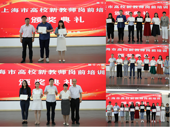 比赛产生特等奖2名、一等奖4名、二等奖6名、优秀奖9名。荀渊、傅建东、彭亚萍、顾娇妮、黄健分别为教学技能大赛获奖学员和培训班奉献服务奖获得者颁发了获奖证书并合影留念。至此,上海市高校新教师岗前培训(第16期)教学技能大赛暨结业典礼顺利结束。
