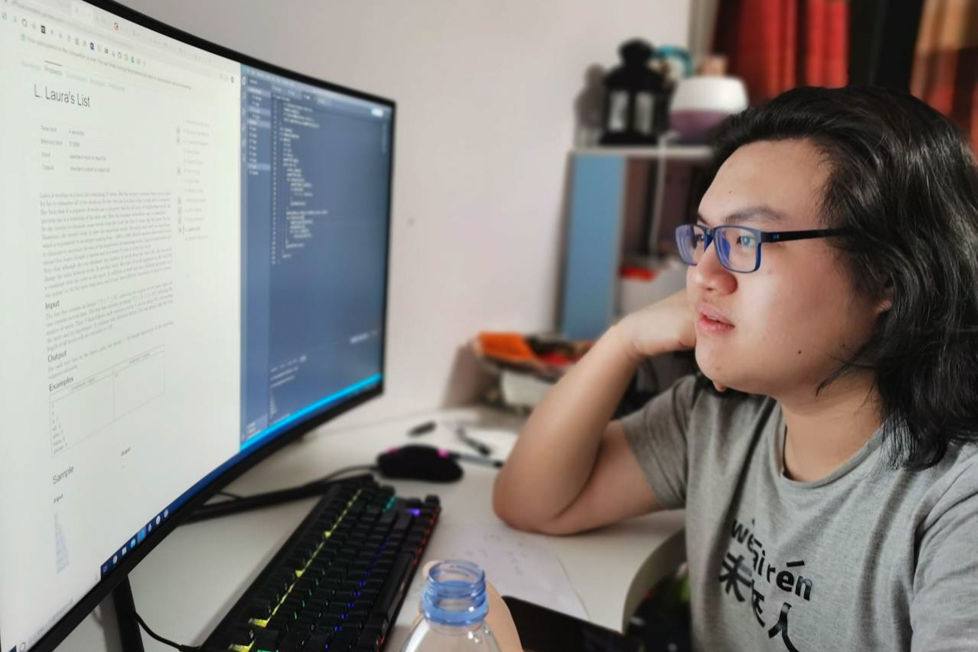 朱桐说,外公外婆家人员众多,没有独立的居住空间,而且大家的生活作息也不尽相同,学习训练环境远不如上海家中。但万幸的是,他随身携带着笔记本电脑和降噪耳机,在家人的理解与支持下,大家为朱桐腾出了餐桌这一相对安静和舒适的地方供他专心训练。朱桐保持着和在上海一样的训练节奏,每周都按照计划和队友训练并且参加Codeforces上的个人比赛。