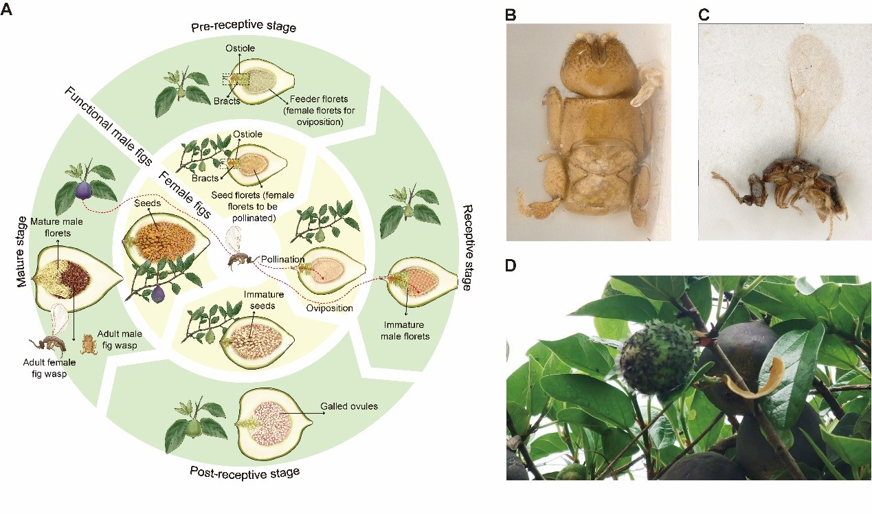 图1. 薜荔及其传粉榕小蜂的生活史(A);雄性薜荔榕小蜂(无翅,身体结构特化,终身在隐头花序中生活)(B);雌性薜荔榕小蜂(C);雌性薜荔榕小蜂聚集于薜荔隐头花序外侧,准备进入花序传粉/产卵(D)(B、C由Jean-Yves Rasplus博士提供)