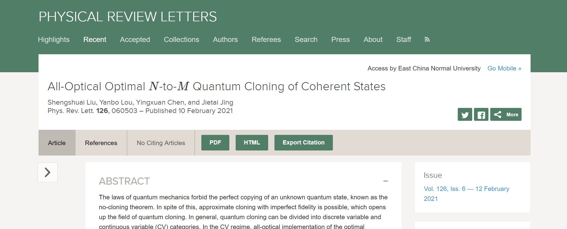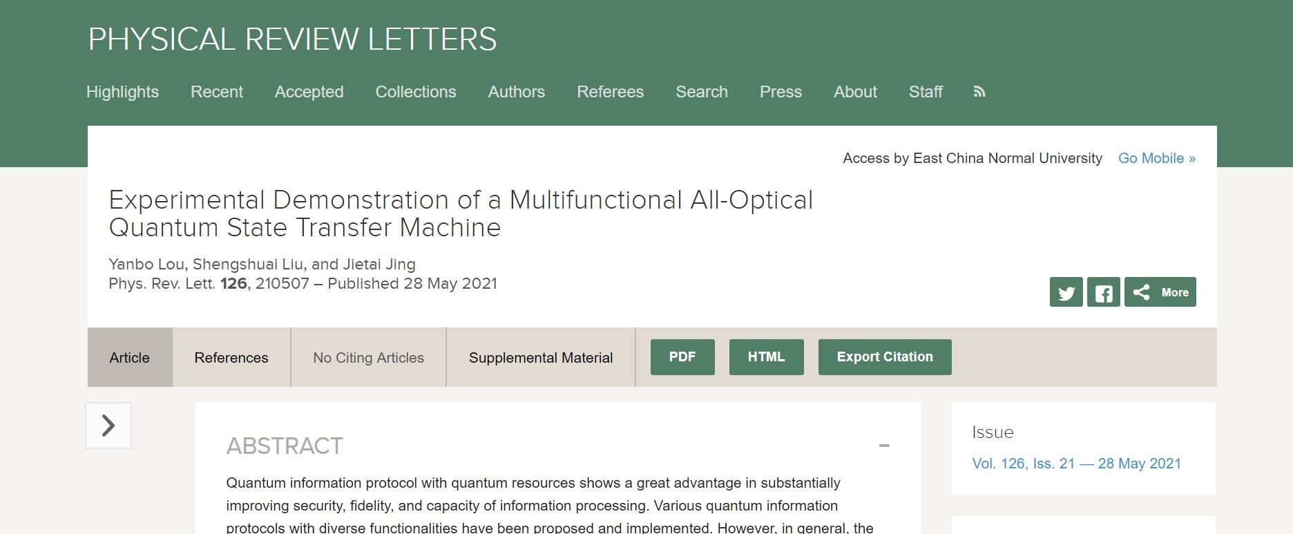 近期,澳门永利皇宫官网入口精密光谱科学与技术国家重点实验室荆杰泰教授团队在量子信息领域连续取得重要进展,两项相关研究成果相继发表于国际物理学重要学术期刊《物理评论快报》(Physical Review Letters 126, 060503 (2021) 以及Physical Review Letters 126, 210507 (2021))。量子信息协议利用量子资源突破经典信息处理方式,从而实现高容量、高保真度以及高安全性的新型信息处理。荆杰泰教授团队长期致力于发展新型量子光源及其在量子信息科学中的应用研究。该团队近期连续取得的两项科研成果聚焦于提升量子信息协议的信息处理保真度,分别在实验上实现了全光学最优化N→M量子克隆和多功能全光量子态传输机,研究了这两种量子信息协议中信息处理保真度提升的机制。
