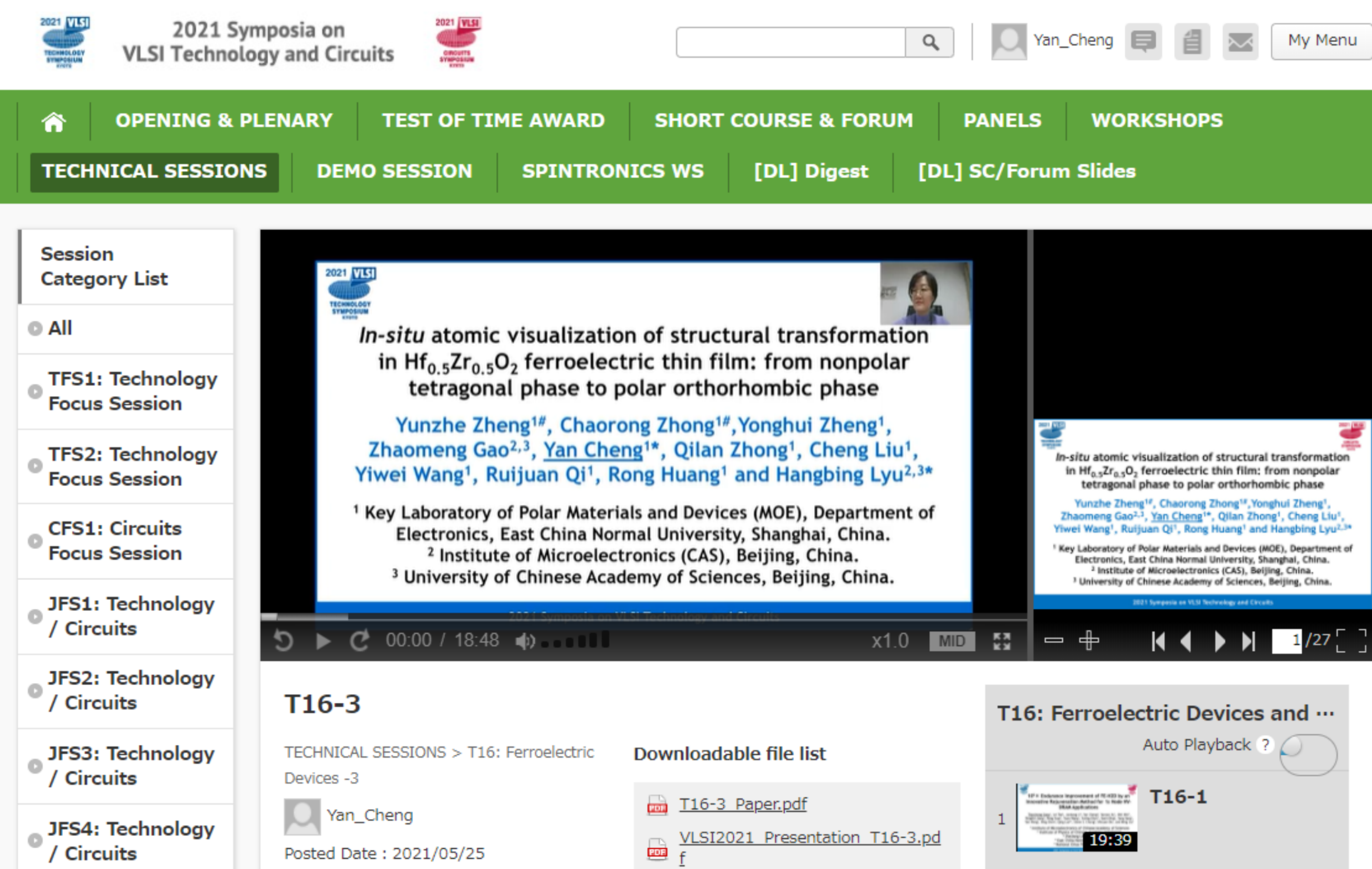 6月13日至6月19日,第41届超大规模集成电路国际研讨会(2021 VLSI)以在线点播(On-demand)和线上实时(Live)的形式举行,华东师大物理与电子科学学院电子科学系/极化材料与器件教育部重点实验室/校电镜中心黄荣/成岩团队的论文In-situ atomic visualization of structural transformation in Hf0.5Zr0.5O2 ferroelectric thin film: from nonpolar tetragonal phase to polar orthorhombic phase入选2021 VLSI Technology,成岩老师应邀作会议报告。该研究工作由澳门永利皇宫官网入口与中科院微电子所共同合作完成,澳门永利皇宫官网入口电子科学系博士研究生郑赟喆和钟超荣为论文的共同第一作者,成岩副研究员和中科院微电子所吕杭炳研究员为论文的共同通讯作者。