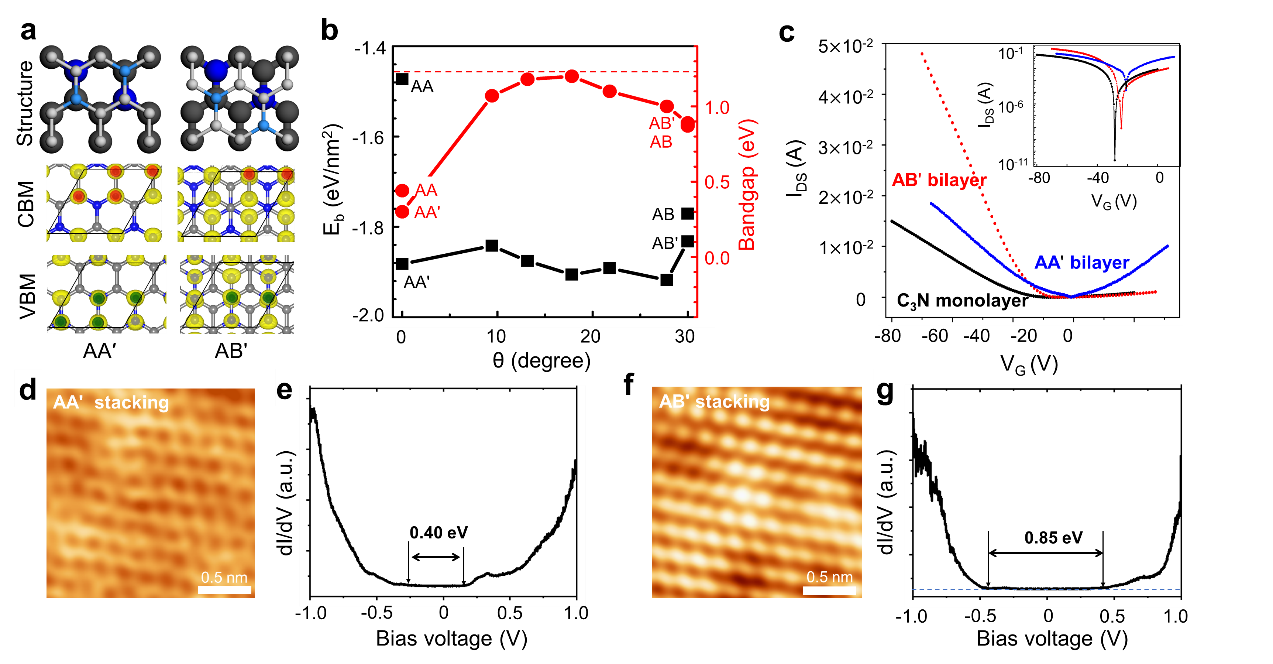 图1.双层C3N热力学稳定性和电子性质图。a, AA′和AB′双层C3N结构示意图和VBM/CBM的分电荷密度图,其中红色和绿色的椭圆形代表上下层C/C和C/N原子pz轨道的重叠。b, 双层C3N不同堆垛结构的结合能和带隙值。c, 4K下,单层C3N和AA′/AB′双层C3N的开关比和载流子迁移率。具有AA′堆垛的双层C3N结构的d, STM表征的原子分辨图和e, dI/dV谱线测量的带隙值。具有AB′堆垛的双层C3N结构的f, STM表征的原子分辨图和g, dI/dV谱线测量的带隙值。