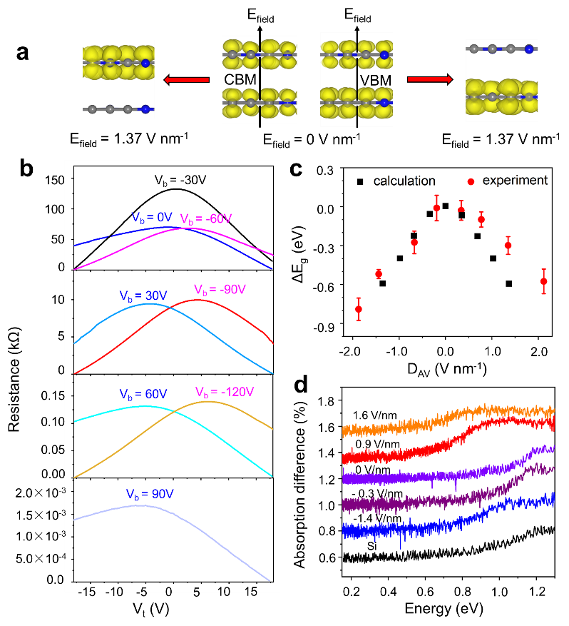 该研究还发现施加外部电场可以有效地调控双层C3N的带隙。理论结果表明,在1.4 V nm-1的外加电场下,AB'堆垛的双层C3N的带隙可减少0.6 eV,基本实现从半导体到金属性的转变。(图2c)双层C3N在外加电场下呈现的显著带隙变化在已有的二维材料中是非常突出的。实验合作团队通过测量不同双门电栅下C3N的电阻(图2b)以及吸收光谱(图2d),得出了与理论预测一致的结论。(图2c)