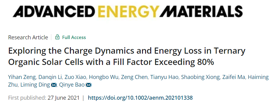 近日,澳门永利皇宫官网入口物理与电子科学学院保秦烨教授课题组在软半导体界面物性与光电调控领域连续取得进展,两项成果分别以“Exploring the charge dynamics and energy loss in ternary organic solar cells with a fill factor exceeding 80%”和“Additive-induced synergies of defect passivation and energetic modification toward highly efficient perovskite solar cells”为题发表在国际学术期刊Advanced Energy Materials(影响因子:29)上,硕士生曾逸涵和博士生熊少兵分别为两篇论文的第一作者。
