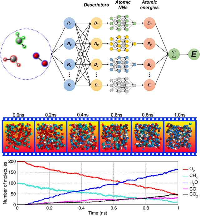 发动机工作在高温高压的严苛工况下,很难通过实验手段对其进行全景式的定量研究。而传统计算模拟方法无法正确高效地处理燃烧过程中剧烈化学反应带来的大量反应路径的量子化学计算。最近,基于人工神经网络的深度学习方法为构建具有量子化学精度、同时十分高效的模拟算法提供了可能。本研究专门为燃烧反应设计了数据库构建方案,采用人工神经网络模型在0.1飞秒的分辨率下对甲烷燃烧过程进行了长达1纳秒的反应分子动力学模拟。