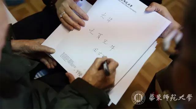 那天,深冬的北京,碧空日和,已过期颐之寿的周有光先生白发朱颜,愉快地与晚辈们用纸笔交流,并题字“大夏光华”。
