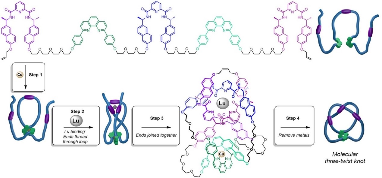 作为分子拓扑学方向的奠基者和开拓者,李大为教授在构筑纳米结构的分子结和探索其性质和功能方向做出了卓越的贡献。在此前的研究中,李大为教授课题组已经报道了很多利用不同金属模板的策略构筑不同复杂程度的单分子结,但仍然缺乏用一条分子链打出多种结的策略。针对这一科学问题,受伴侣蛋白(Chaperone)机制启发,李大为教授团队基于上述工作,在一条分子链上,利用过渡金属离子和镧系金属离子作为正交模板,通过点手性诱导构筑了具有单一拓扑手性的分子结52。此外,研究人员也能够利用该分子链选择性合成大环01(unknot)和分子结31另外两种拓扑异构体。这不仅提供了构筑复杂分子结的策略,同时也推动了分子拓扑学的发展。
