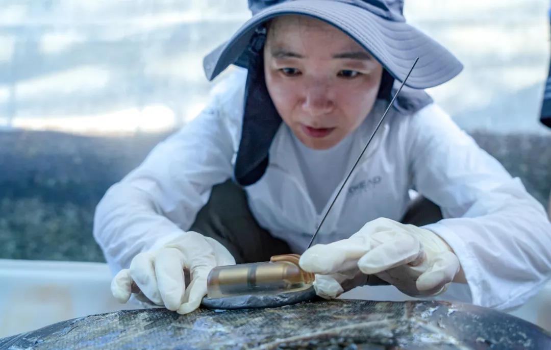 陈珉为海龟安装跟踪装置