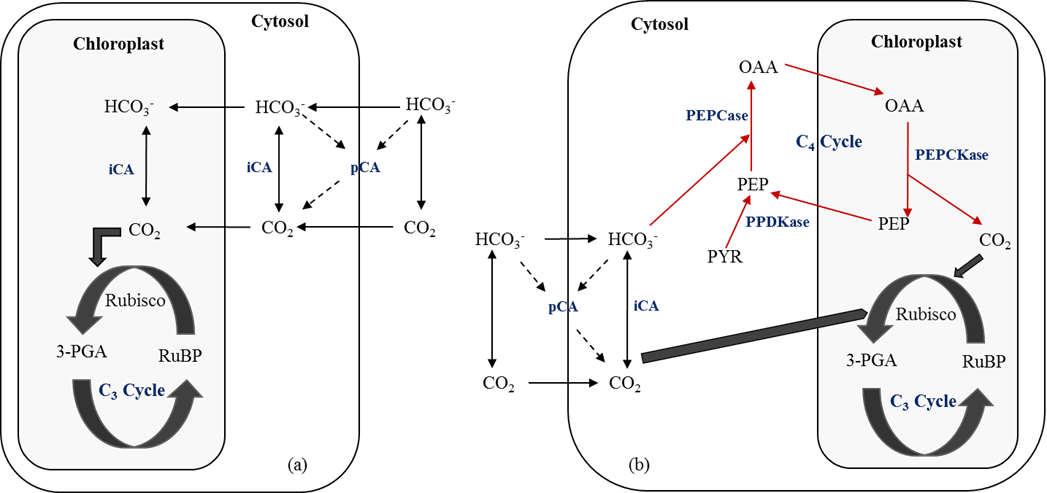 图1. (a)藻类常见的固碳模式; (b) 浒苔的固碳模式